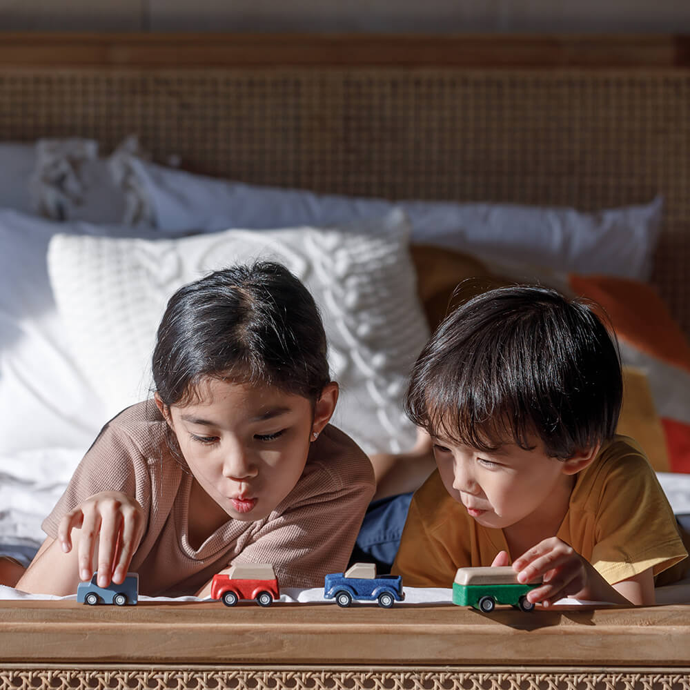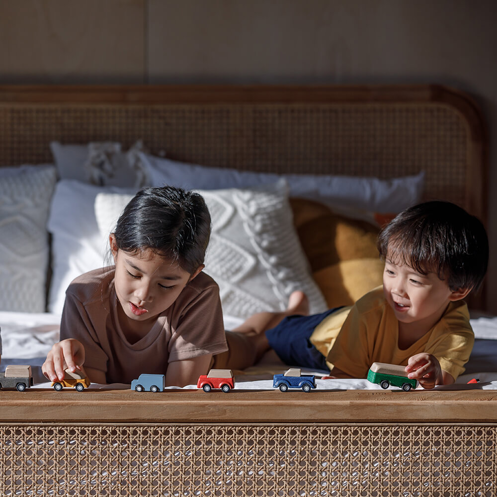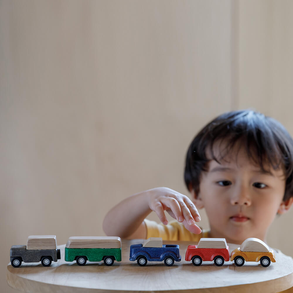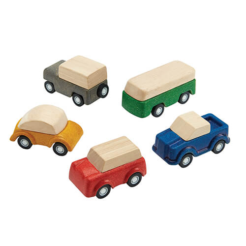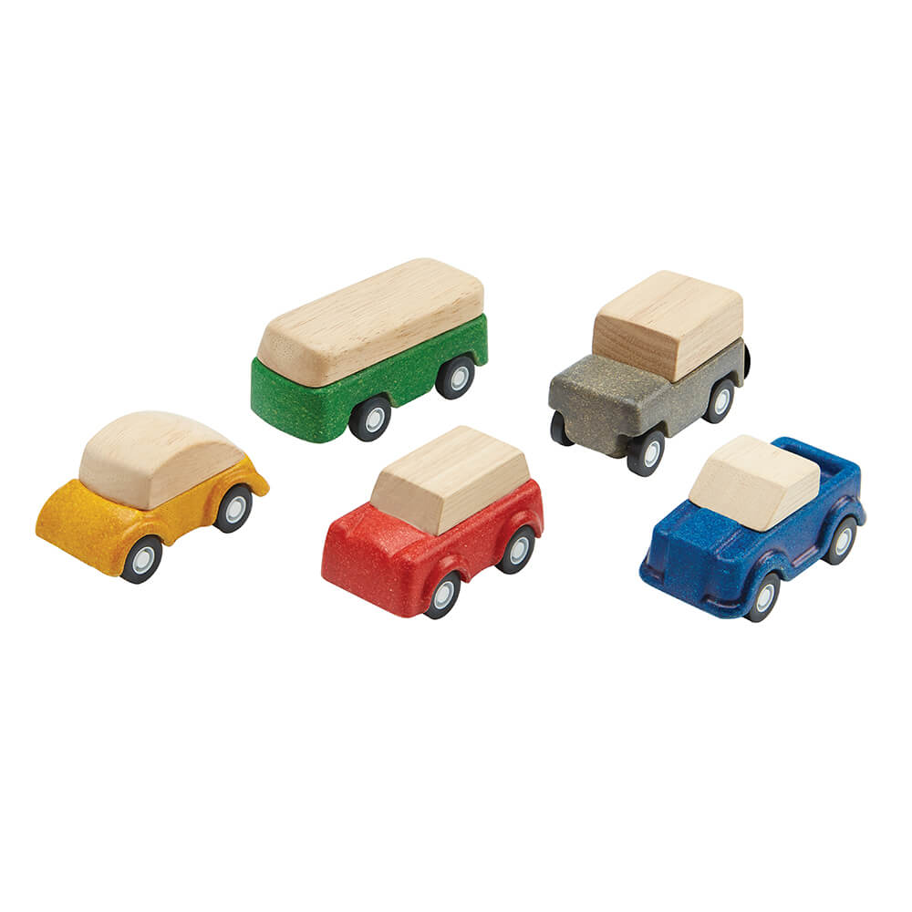 A tömörfa és a PlanWood egyedi kombinációjával készült játékkészlet 5 különböző járműből áll: szürke kombi, piros SUV, sárga autó, zöld busz és kék teherautó.