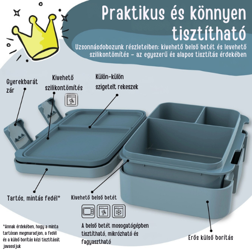 - Biztonság – Minden uzsonnásdoboz és kulacs BPA-mentes, független laboratóriumban tesztelt, így a szülők nyugodtan bízhatnak benne.