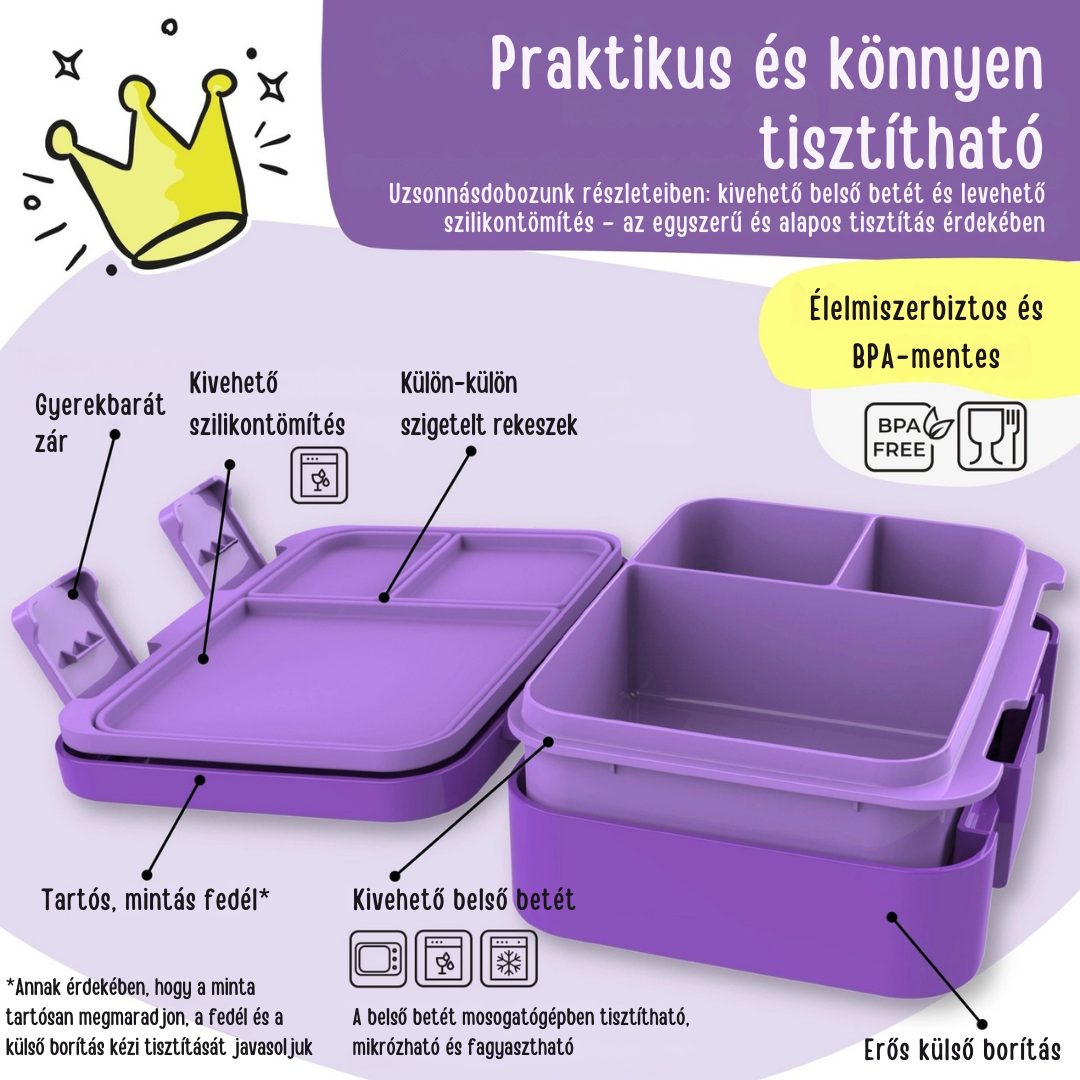 - Biztonság – Minden uzsonnásdoboz és kulacs BPA-mentes, független laboratóriumban tesztelt, így a szülők nyugodtan bízhatnak benne.