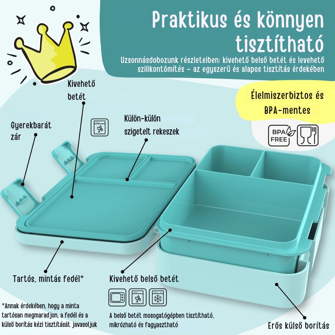 - Biztonság – Minden uzsonnásdoboz és kulacs BPA-mentes, független laboratóriumban tesztelt, így a szülők nyugodtan bízhatnak benne.