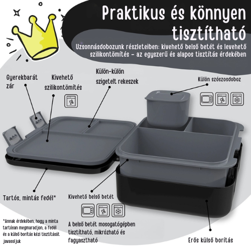 - Szivárgásmentes kialakítás 💧 – erős szilikontömítéssel és mikrózható belső betéttel, hogy az ételek mindig frissek maradjanak