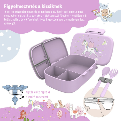 Mesés uzsonnázás kis hősöknek! 🌟 Ez a 100 % szivárgásmentes bento-uzsonnásdoboz 🎒 osztott rekeszekkel segíti a változatos étkezést, BPA-mentes és mosogatógépben tisztítható — egyszerű, biztonságos és szívet melengető segítség a mindennapokban. 🥪👍