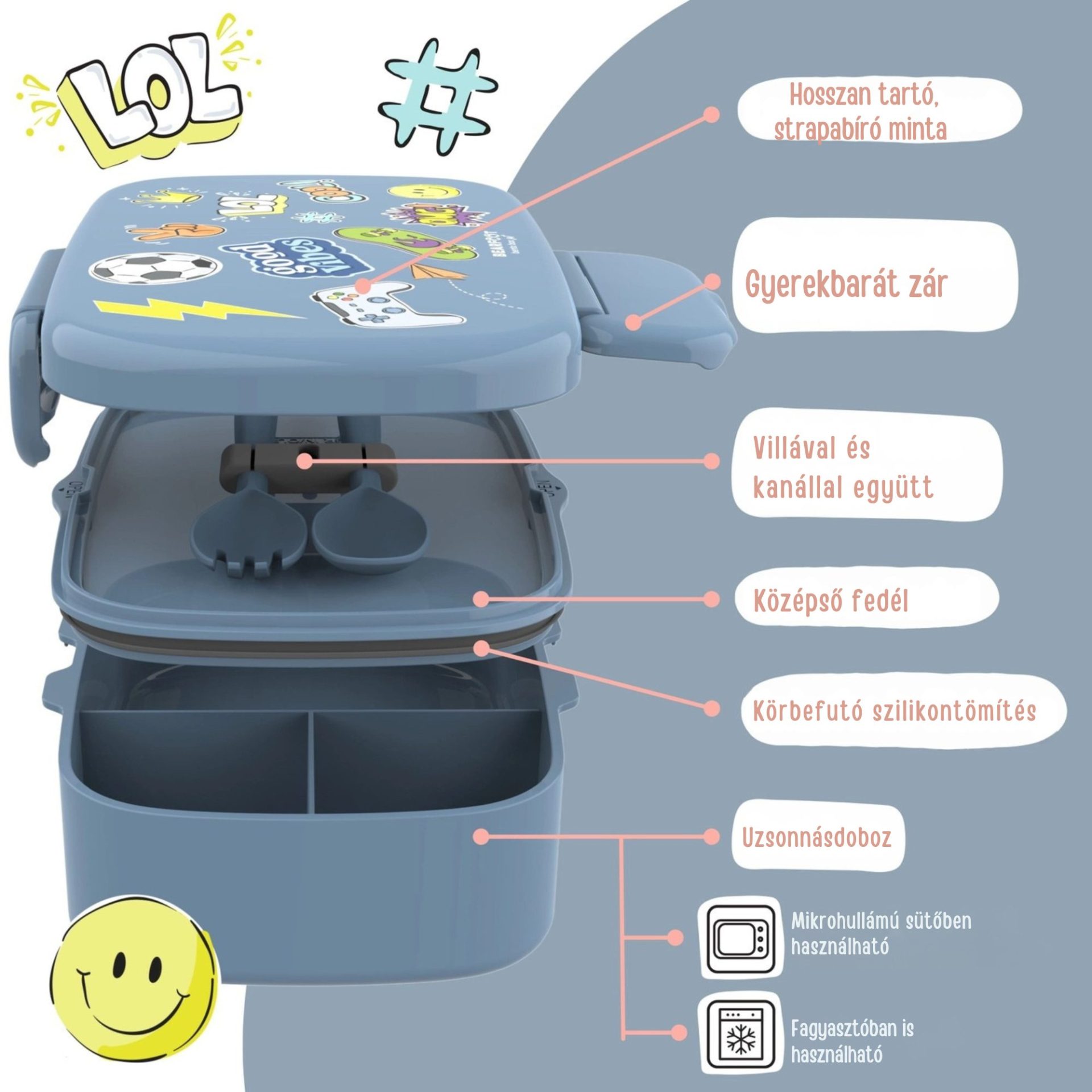 - Osztott rekeszek 🍏 – a változatos és kiegyensúlyozott étkezésekért, a praktikus elrendezésnek köszönhetően.