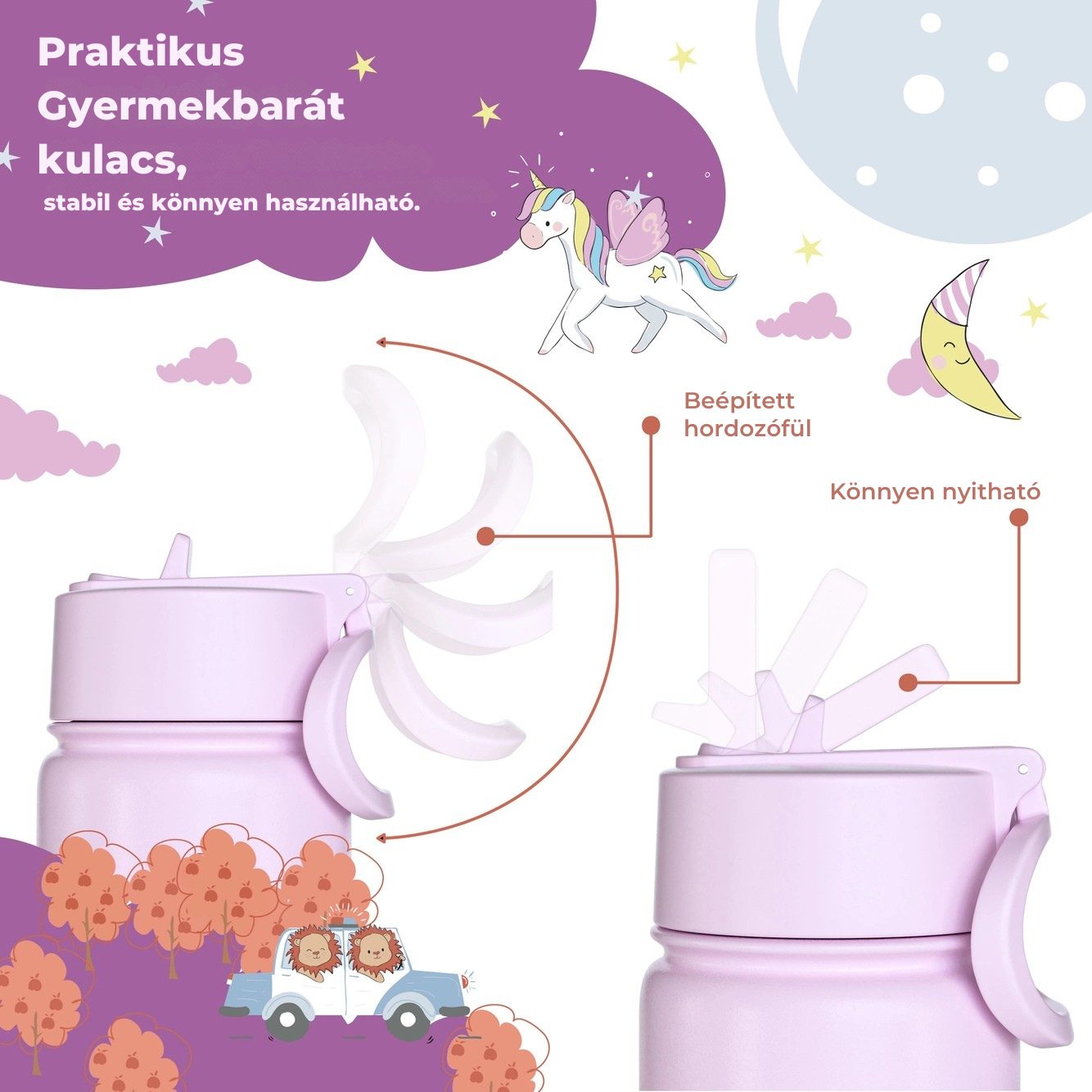 A palack nagy ivónyílással rendelkezik, könnyen nyitható 🔓, és szívószállal vagy anélkül is használható. Beépített hordfülének köszönhetően a kicsik is könnyedén magukkal vihetik.