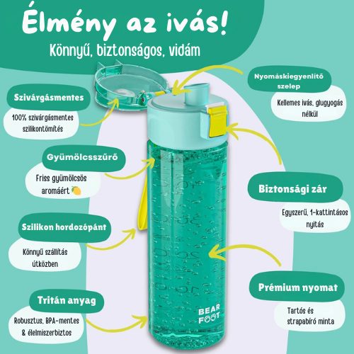 Ez a vidám színű kulacs nem csupán praktikus, hanem igazi élményforrás a gyerekek számára. A játékosságot ötvözi a gondos tervezéssel: Tritanból készült, BPA-mentes, szivárgásmentes és strapabíró – a mindennapokat egy mosolyos kalanddá varázsolja.