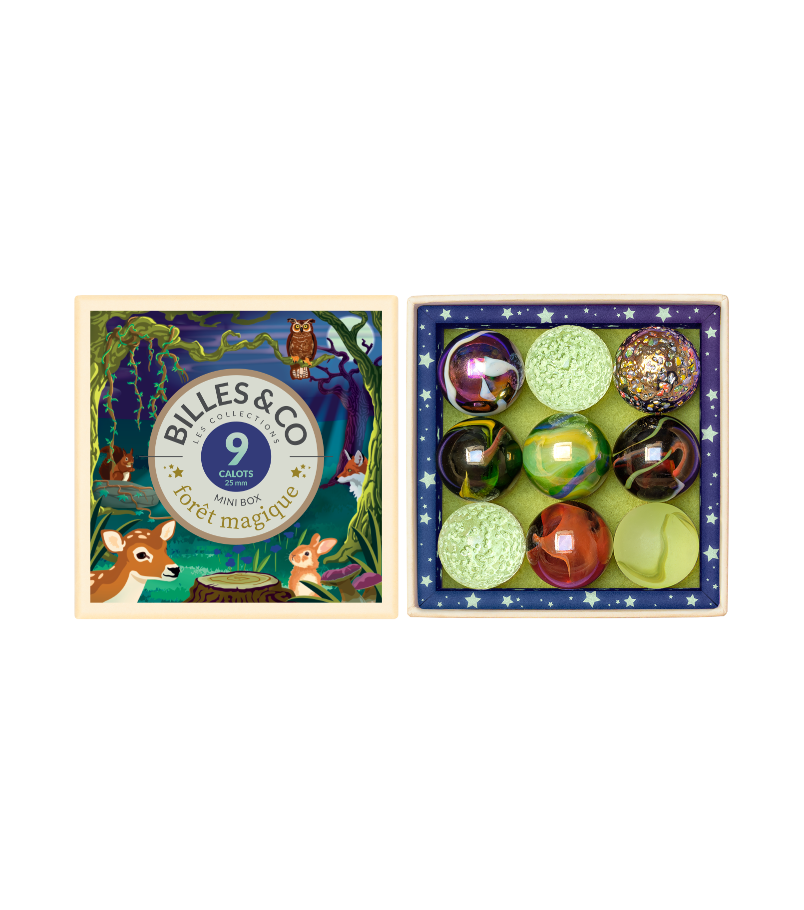 A Magic Forest nagy üveggolyó szett igazi kincs mindazok számára, akik szeretik az egyedi, fantáziadús játékokat. Kilenc gyönyörű, gondosan válogatott nagy üveggolyó rejtőzik ebben a különleges dobozban – mindegyik más-más textúrával és színvilággal: találkozhatsz szikrázó nugget-golyókkal, sejtelmes matt felületűekkel, átlátszó, színes példányokkal és márványozott darabokkal is.
