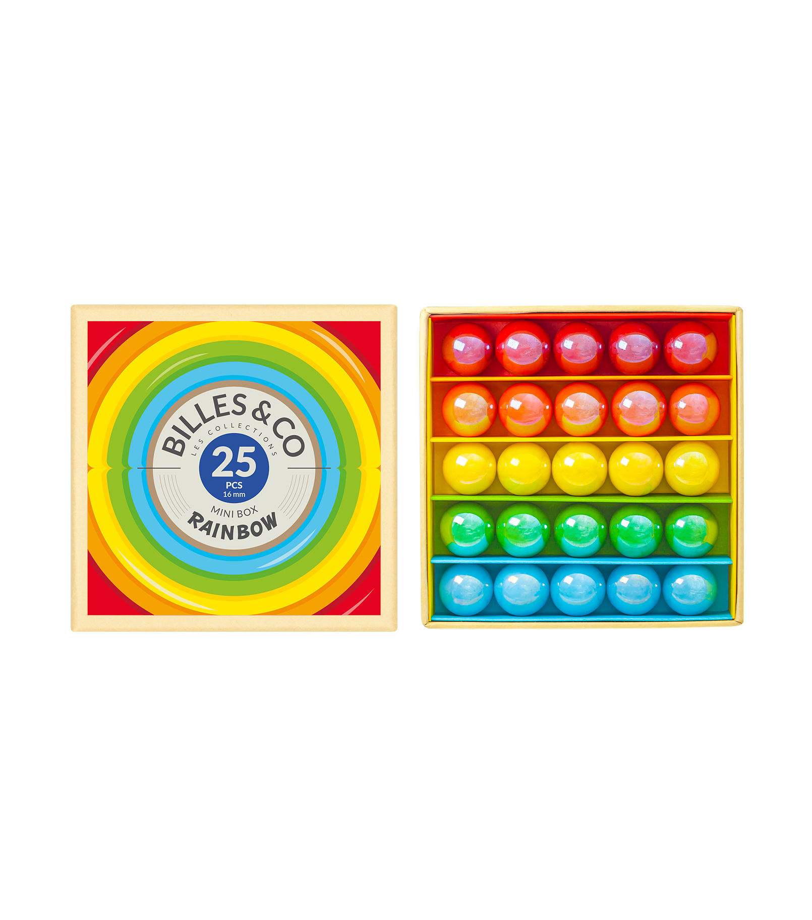 A Rainbow kis doboz egy valódi színkavalkád, amely játékosan fejleszti gyermeked érzékelését, kreativitását és koncentrációját. A készlet 25 darab, 16 mm-es üveggolyóból áll, melyek az eső utáni szivárvány legszebb árnyalataiban pompáznak. Ezekkel a csillogó golyókkal a gyerekek nemcsak játszhatnak, hanem színeket tanulhatnak, számolhatnak, szortírozhatnak – miközben minden egyes nap újabb és újabb történeteket találhatnak ki hozzájuk.