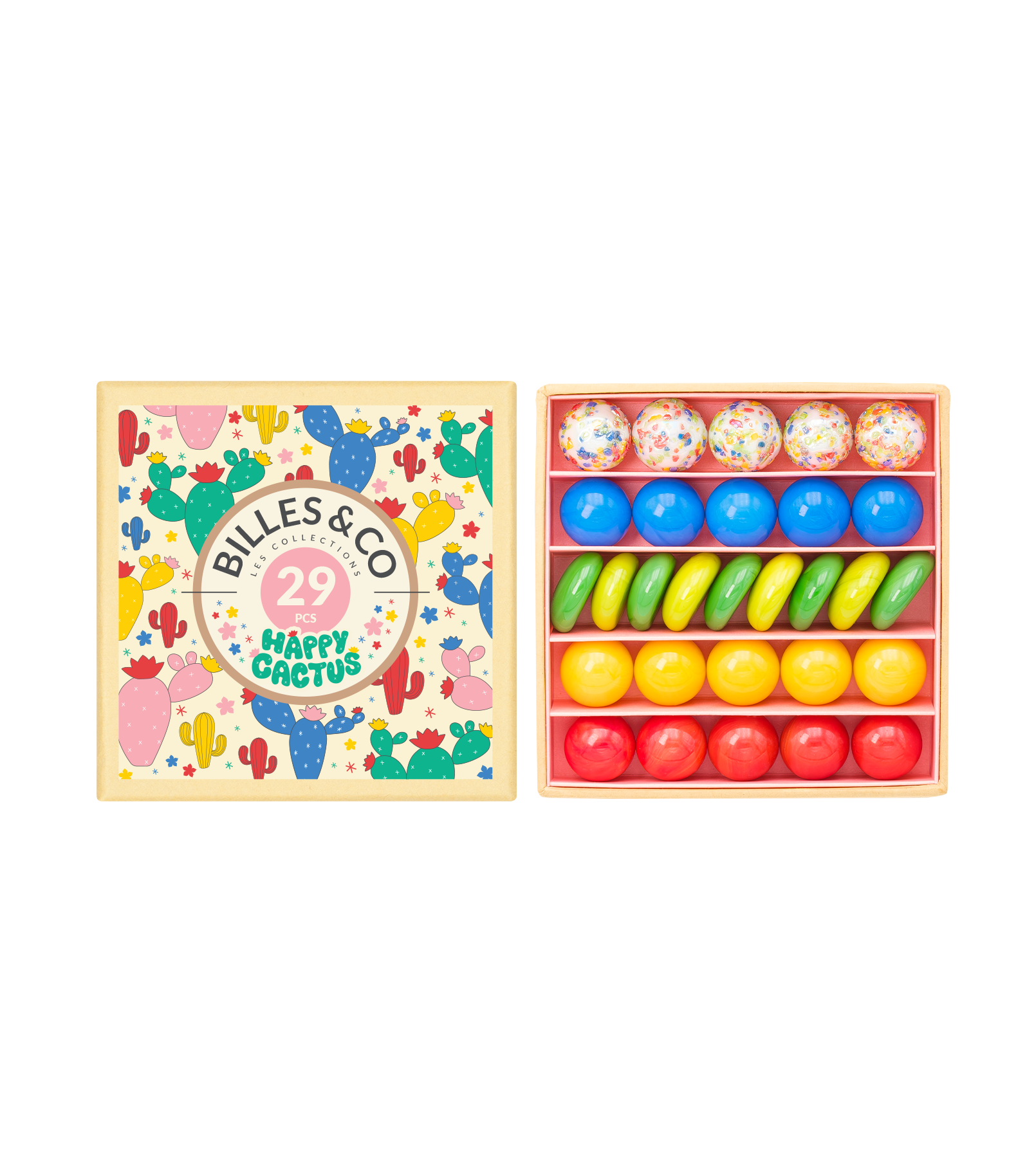 Fedezzétek fel a színek és formák világát a Billes & Co Happy Cactus üveggolyó készlettel – egy vidám, oktató és esztétikus játékélmény, amely egyszerre fejleszti gyermeked képességeit és szórakoztatja őt.