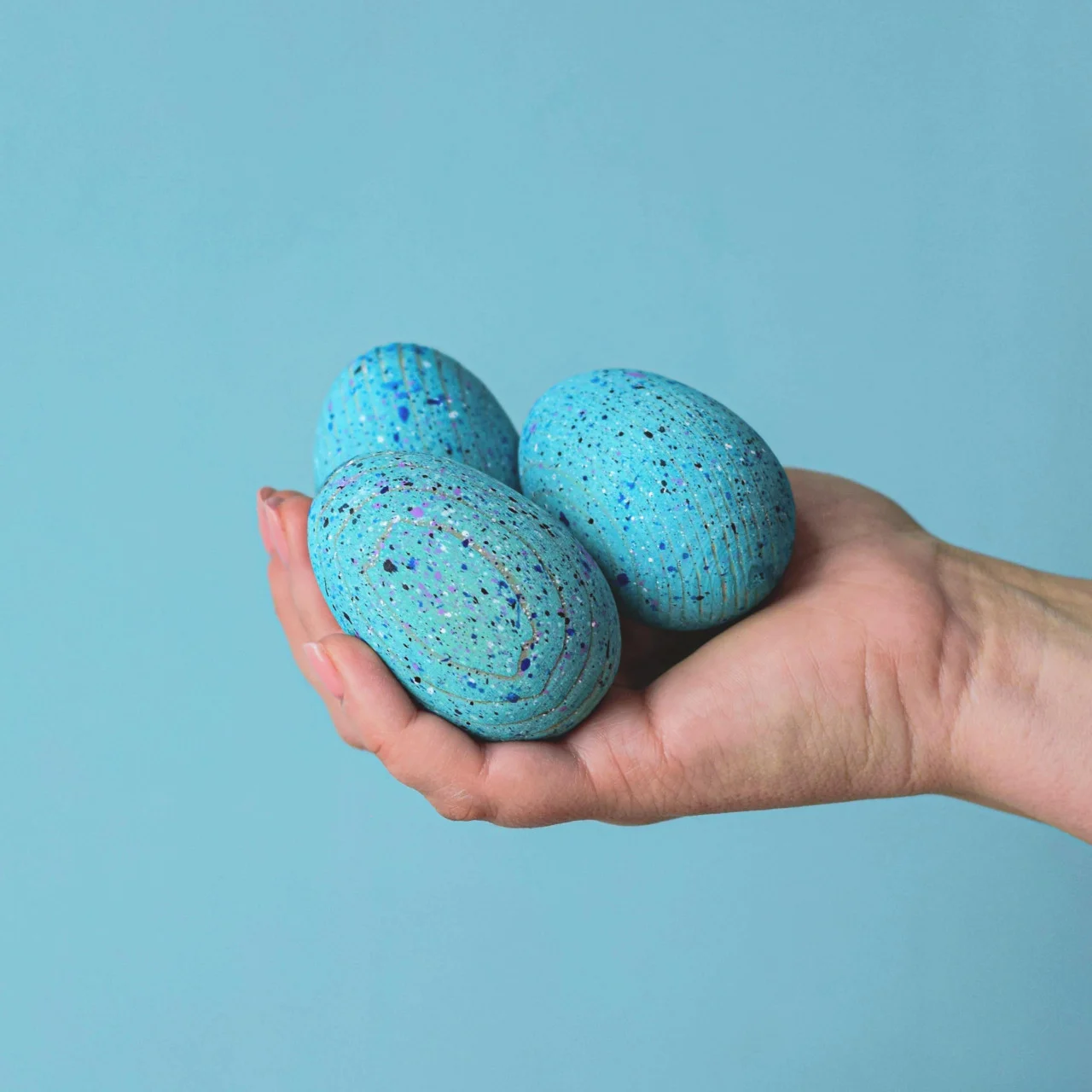 A fenntartható forrásból beszerzett bükkfából készült és élénk színekkel festett tojások őskori kalandokra hívják a gyerekeket.