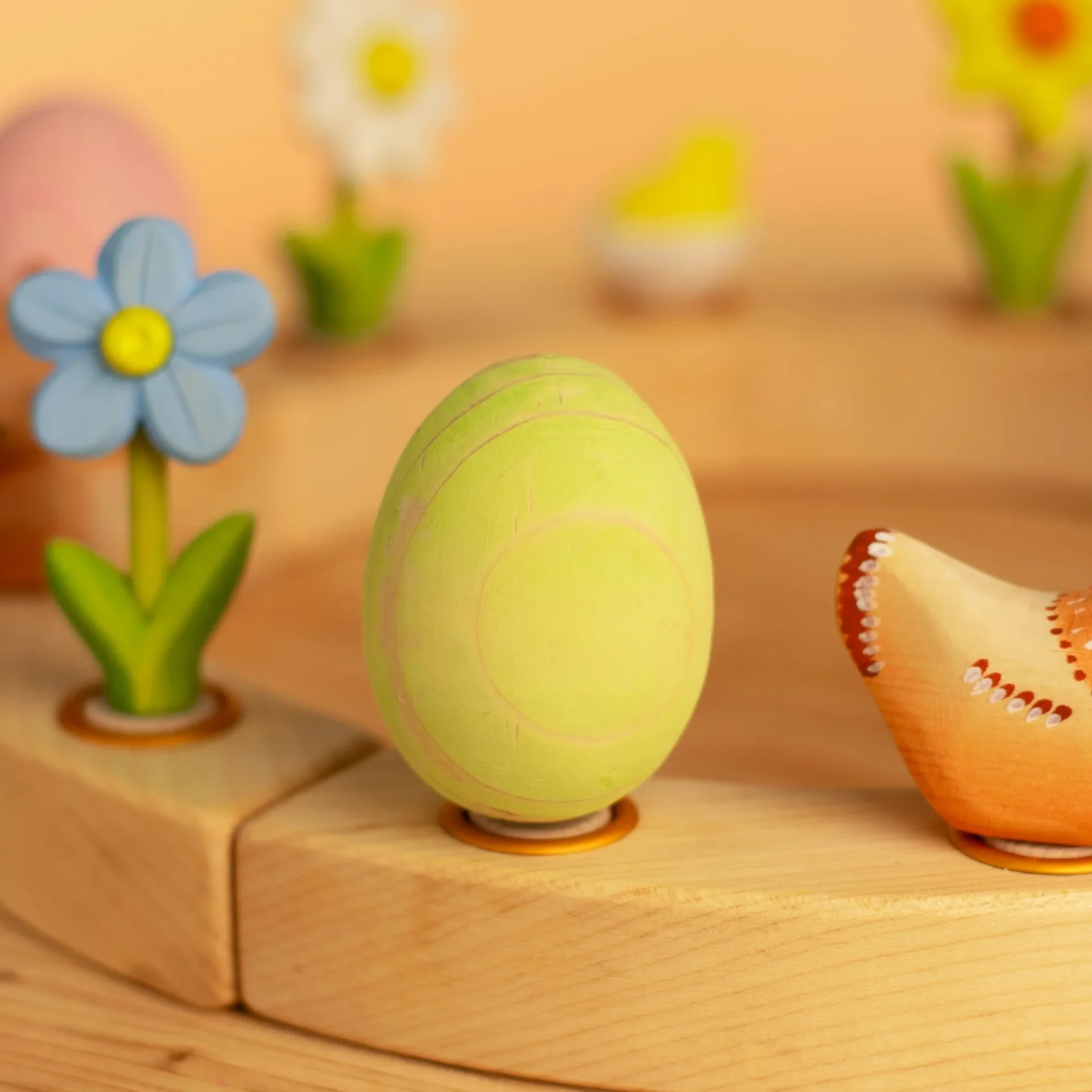 Ez a kézzel faragott, finoman festett kék húsvéti tojás a megújulás és az új kezdet jelképe. Tökéletes kiegészítője a húsvéti dekorációnak, ünnepi gyűrűnek vagy évszakasztalnak – és közben játék is.