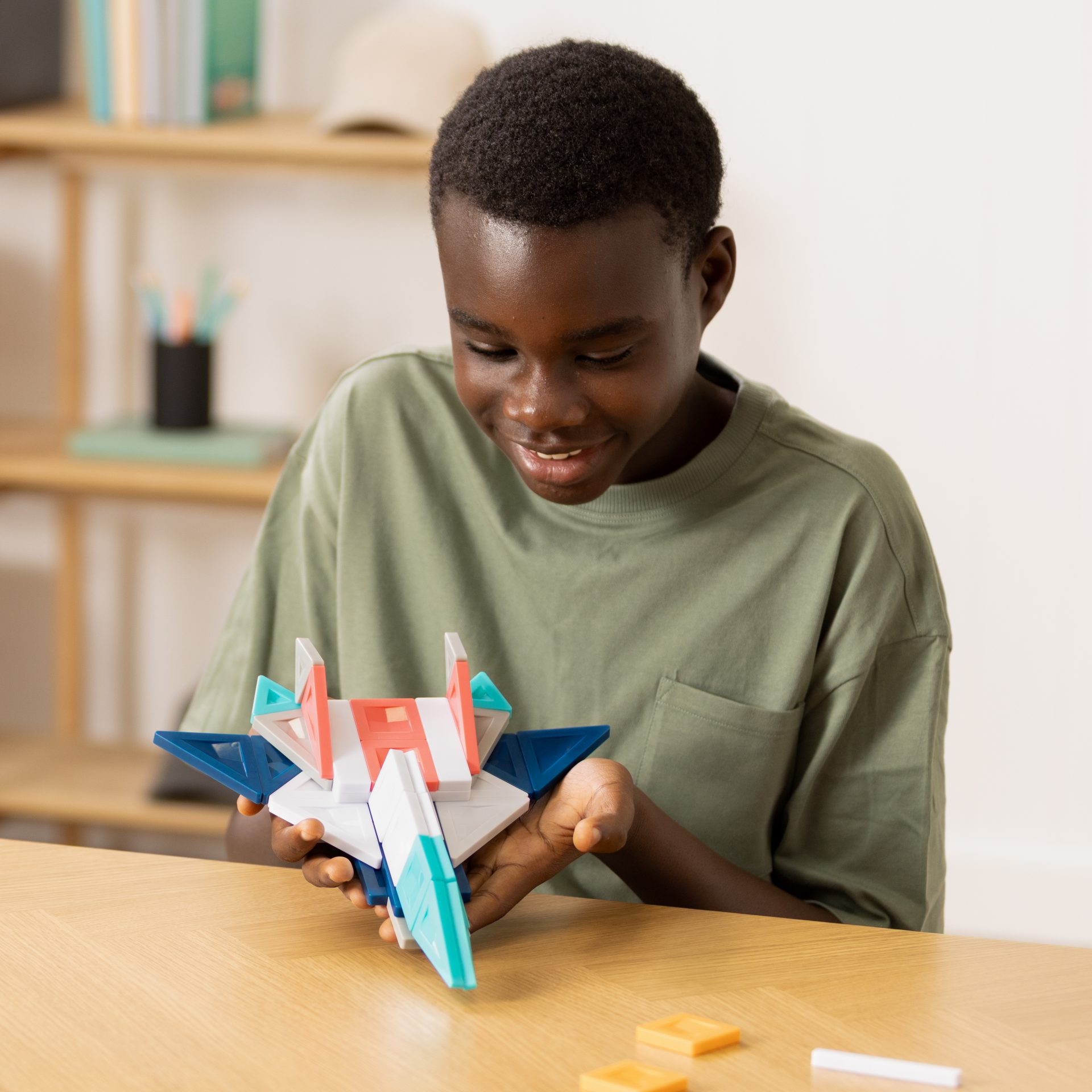 A matt, kontrasztos színek építészeti hangulatot adnak az elkészült alkotásoknak. A mágnesek illeszkedése finom kattanással jár, ami egyszerre biztosít stabilitást és szenzoros élményt – szinte fidget-hatásként.