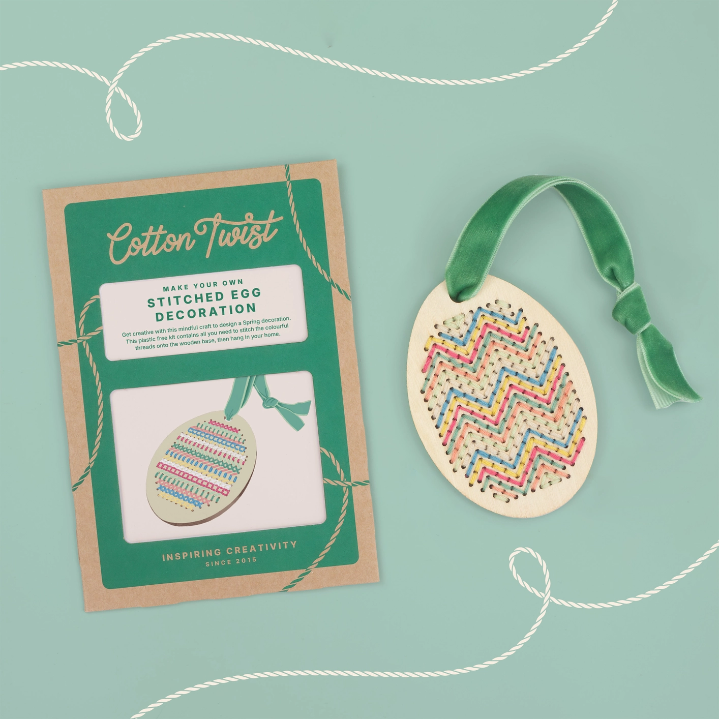 A készlet minden szükséges eszközt tartalmaz az alkotáshoz: egy fa tojást, 7 pasztell színű pamutcérnát, gyerekbarát fém hímzőtűt és egy élénk, puha bársony szalagot a dísz fellógatáshoz.