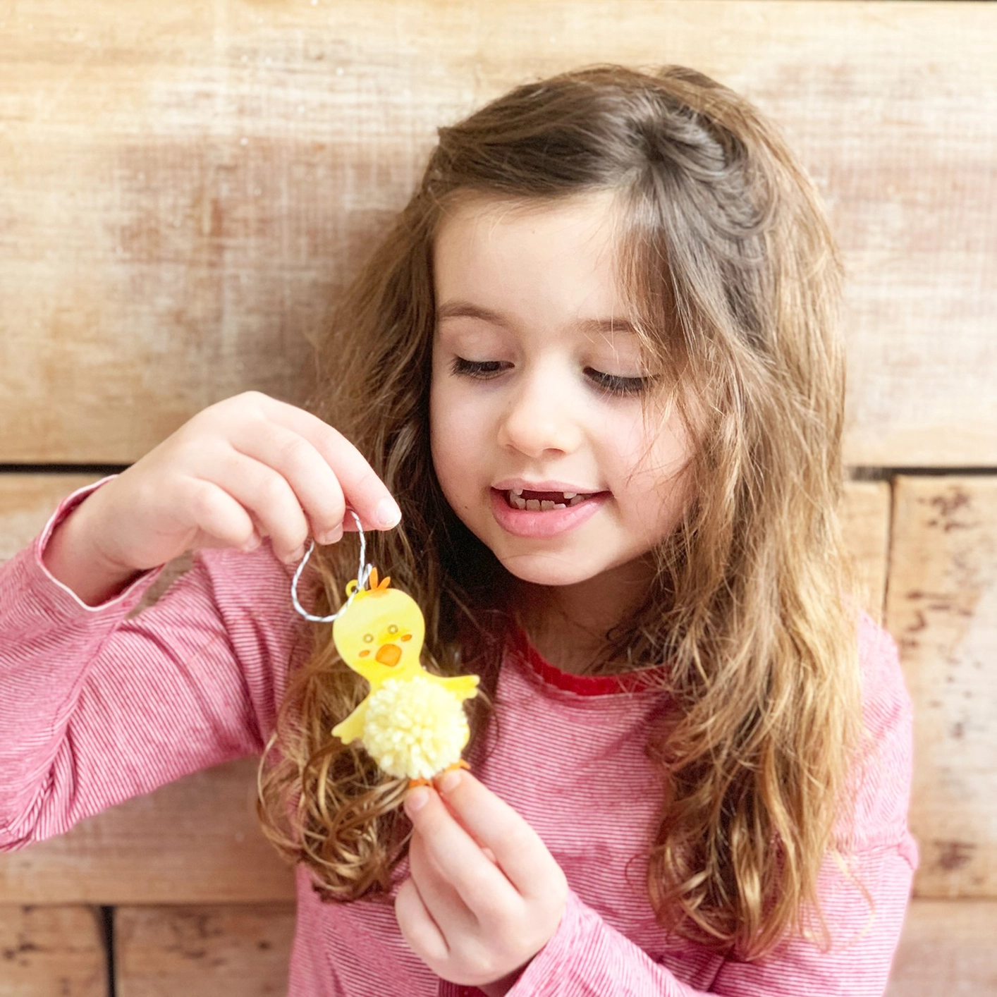 A gyerekek először akvarellceruzákkal kiszínezik a fa csibét, majd elkészítik a puha, bolyhos pompom pocakot, amelyet a figurára rögzítenek. Az eredmény egy igazán pihe-puha, szerethető csibe, amely dekorációként és játékfiguraként is megállja a helyét.
