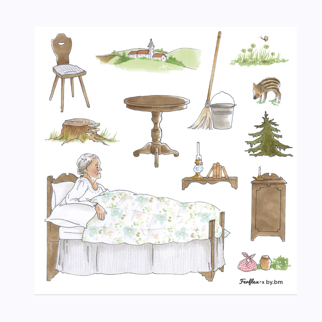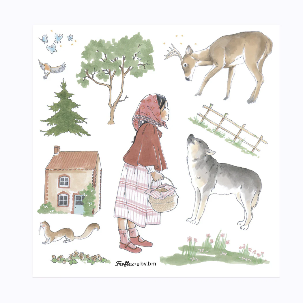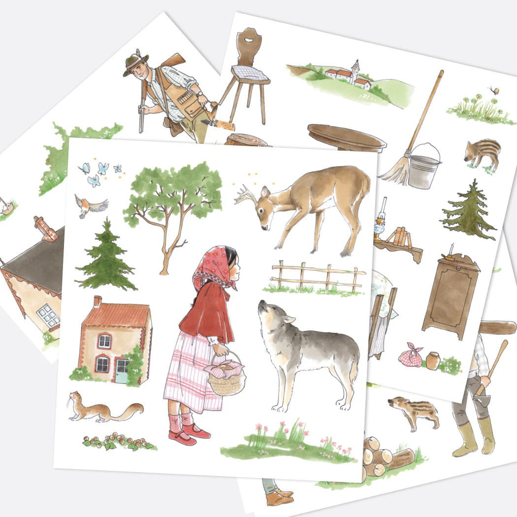 A mágnesek között megtalálhatóak a történet kulcsfigurái és kulisszái, például Piroska, a farkas, a nagymama háza, Piroska saját otthona, favágó, vadász és erdei díszletelemek.