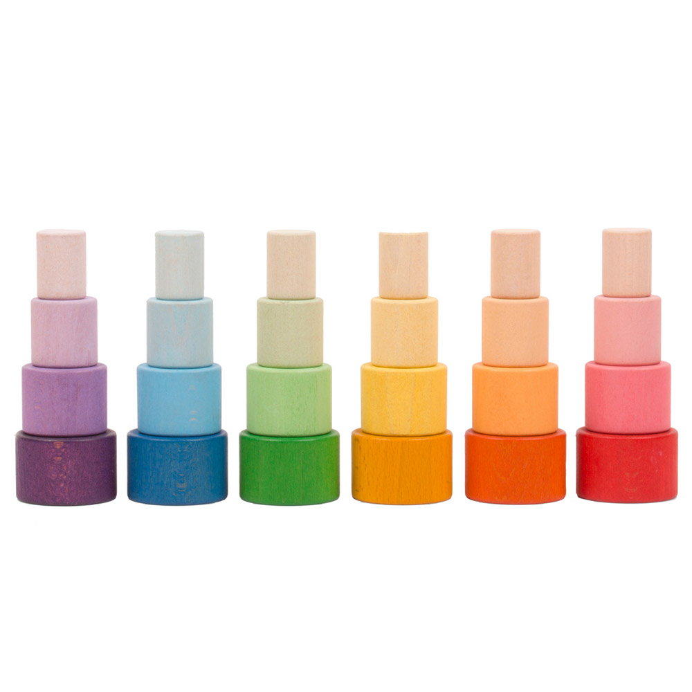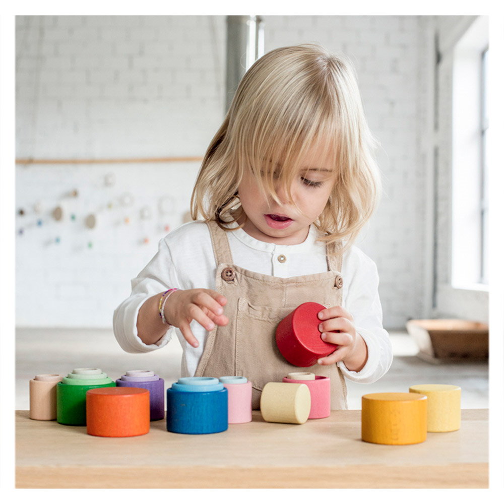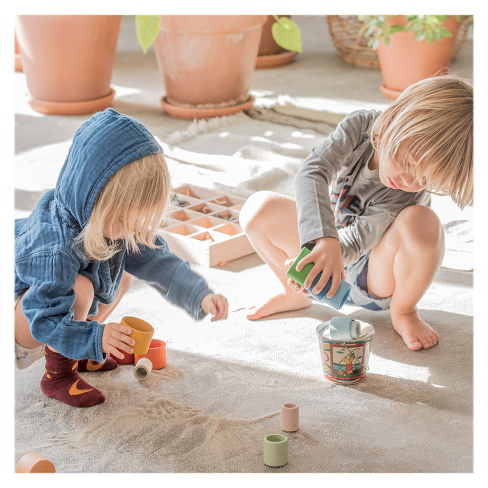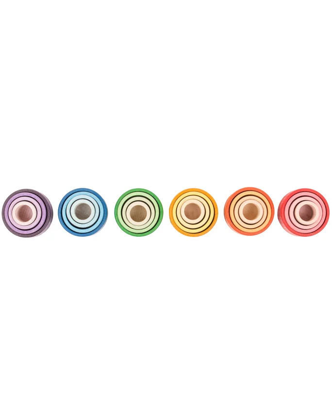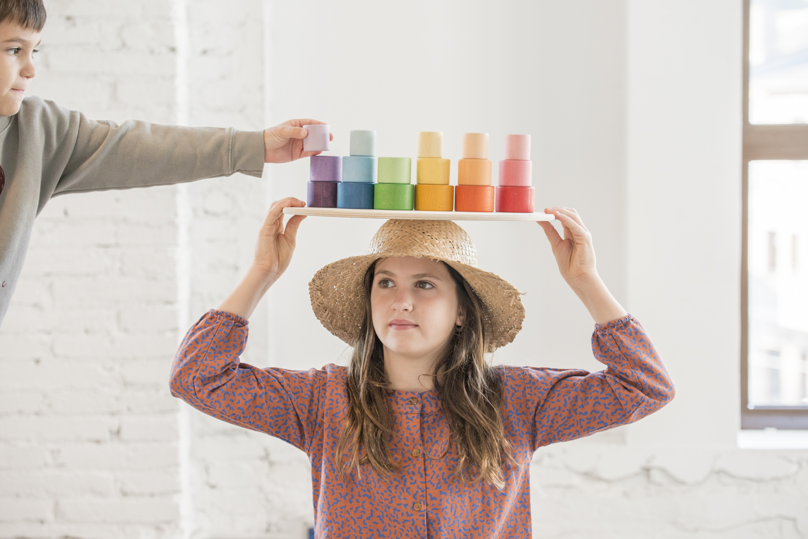 24 db egymásba illő tálka 4 különböző méretben és 6 különböző színben, színátmenetesen. A 6 szín mindegyike 4 tálat tartalmaz, amelyek árnyalatai a világostól a sötétig változnak. Pakoljátok őket egymásra, rejtsetek el dolgokat, válogassatok, töltsétek fel, ürítsétek ki a tálkákat, remek elfoglaltság lesz az apró kezek számára..