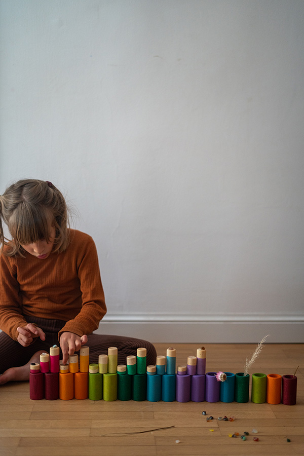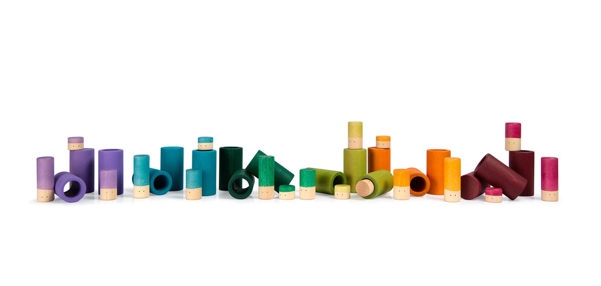 A szett tartalma: 6 nagy figura, 6 közepes figura, 6 kis figura, 6 cső, 6 tömör henger és 6 kisebb cső.