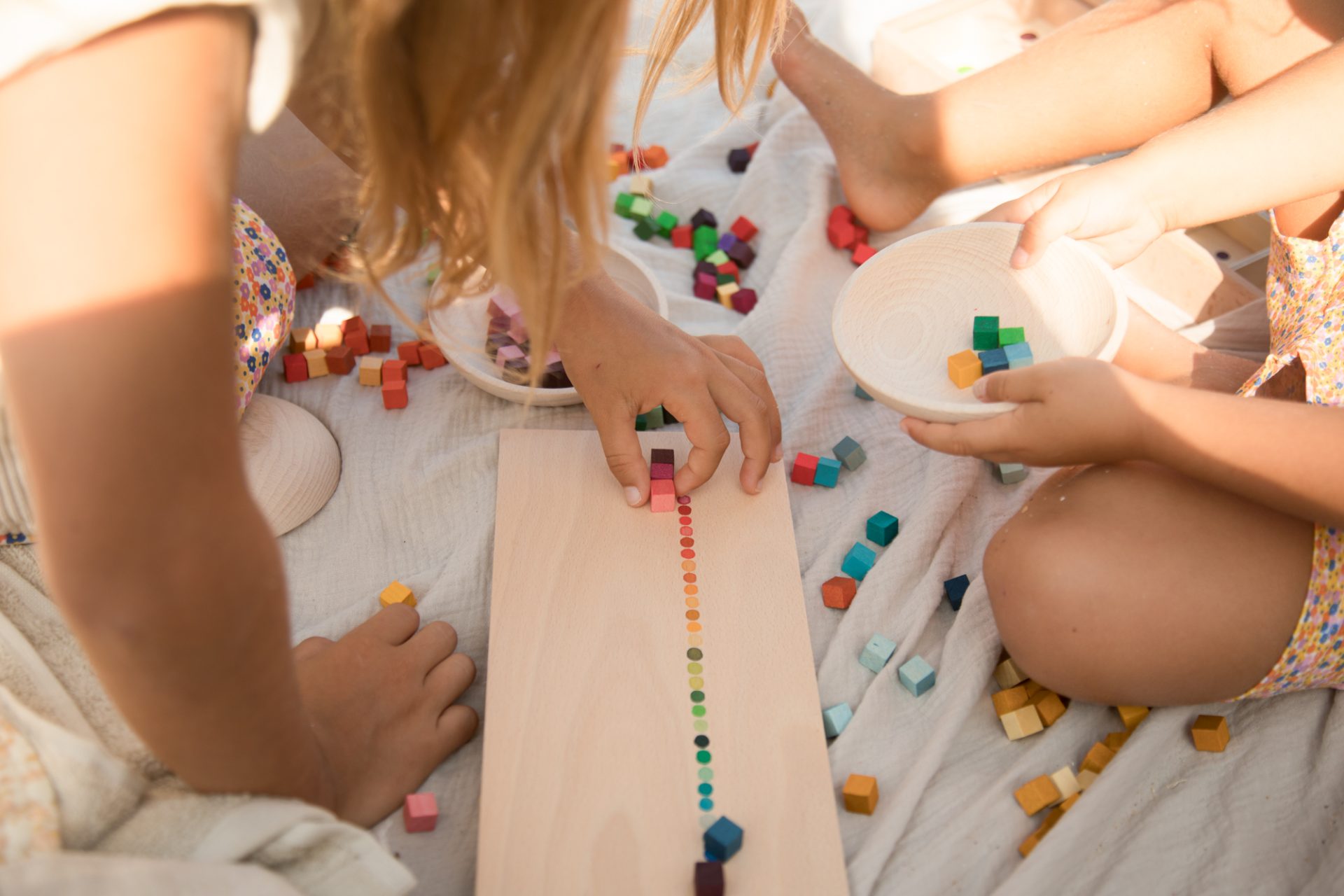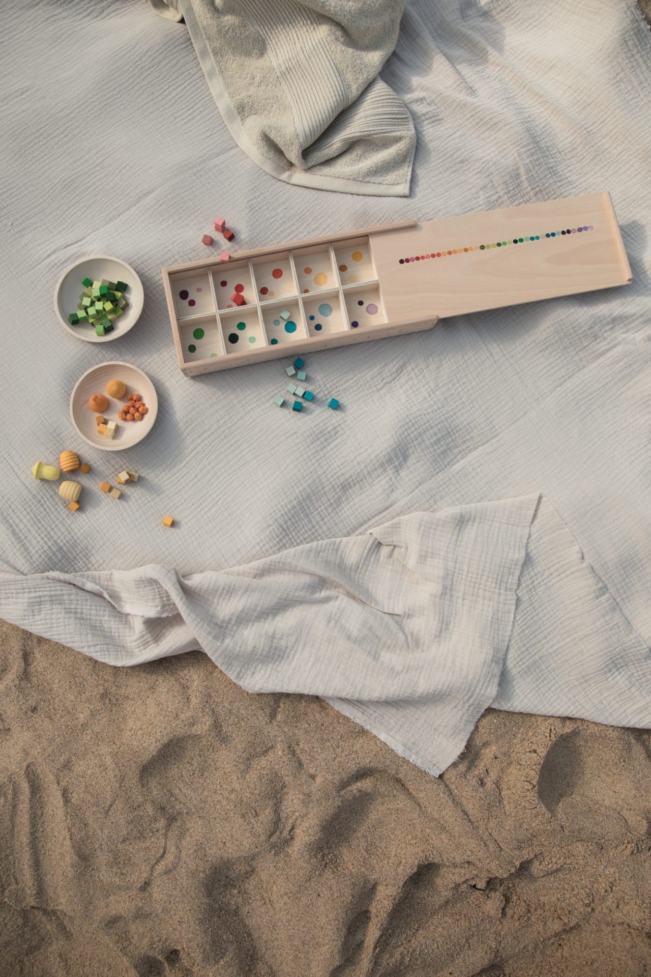 Több mint 400 kis fakockát tartalmaz a szivárvány 36 színében, színátmenetesen, valamint egy kézzel festett fa válogatódobozt.