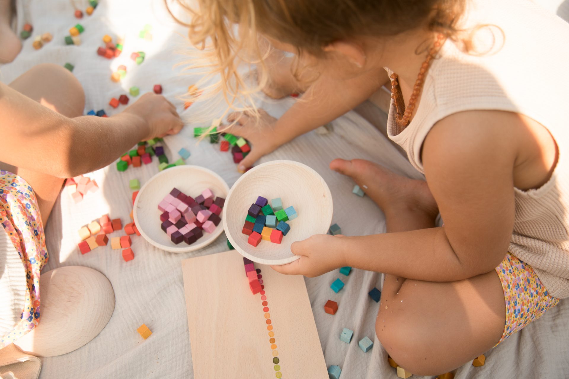 A „Mis and match” színes kockák gyűjteménye fa válogatódobozban. Használjátok akár szabad játékra vagy mozaik készítésére, mandalázásra, a gyerekek játék közben a matematikai és geometriai fogalmakat saját kezükkel fedezhetik fel. Keressetek a természetben a kockákkal megegyező színeket vagy rakjátok ki a szivárvány színsorrendjében, ez a kis készlet hosszú, minősgéi játékidőt biztosít nektek.