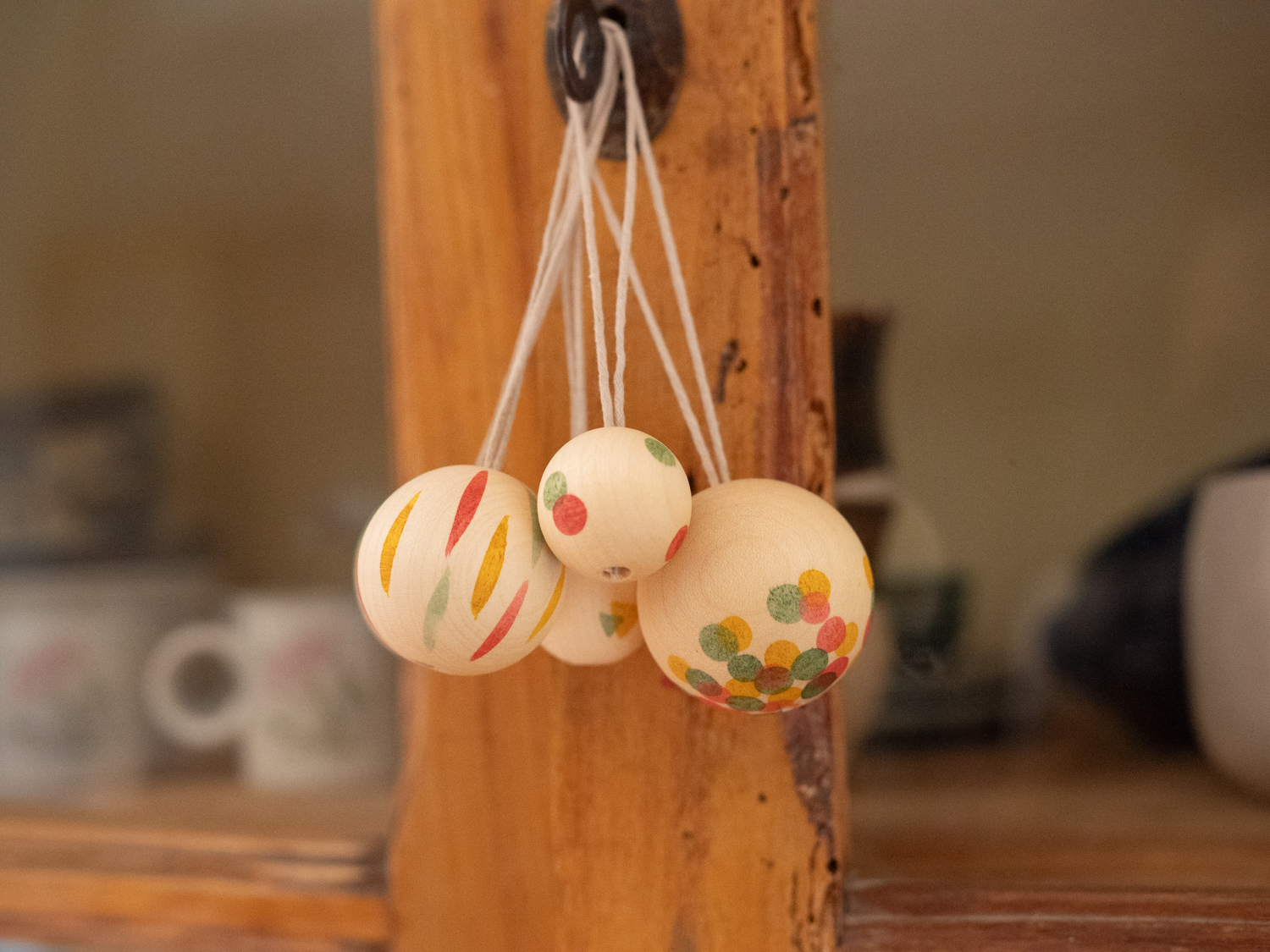 5 db gömb alakú, kézzel festett fa dísz. Tartalmazza a cérnát, hogy  felakasztó legyen.. 25 mm ø-től 40 mm ø-ig.