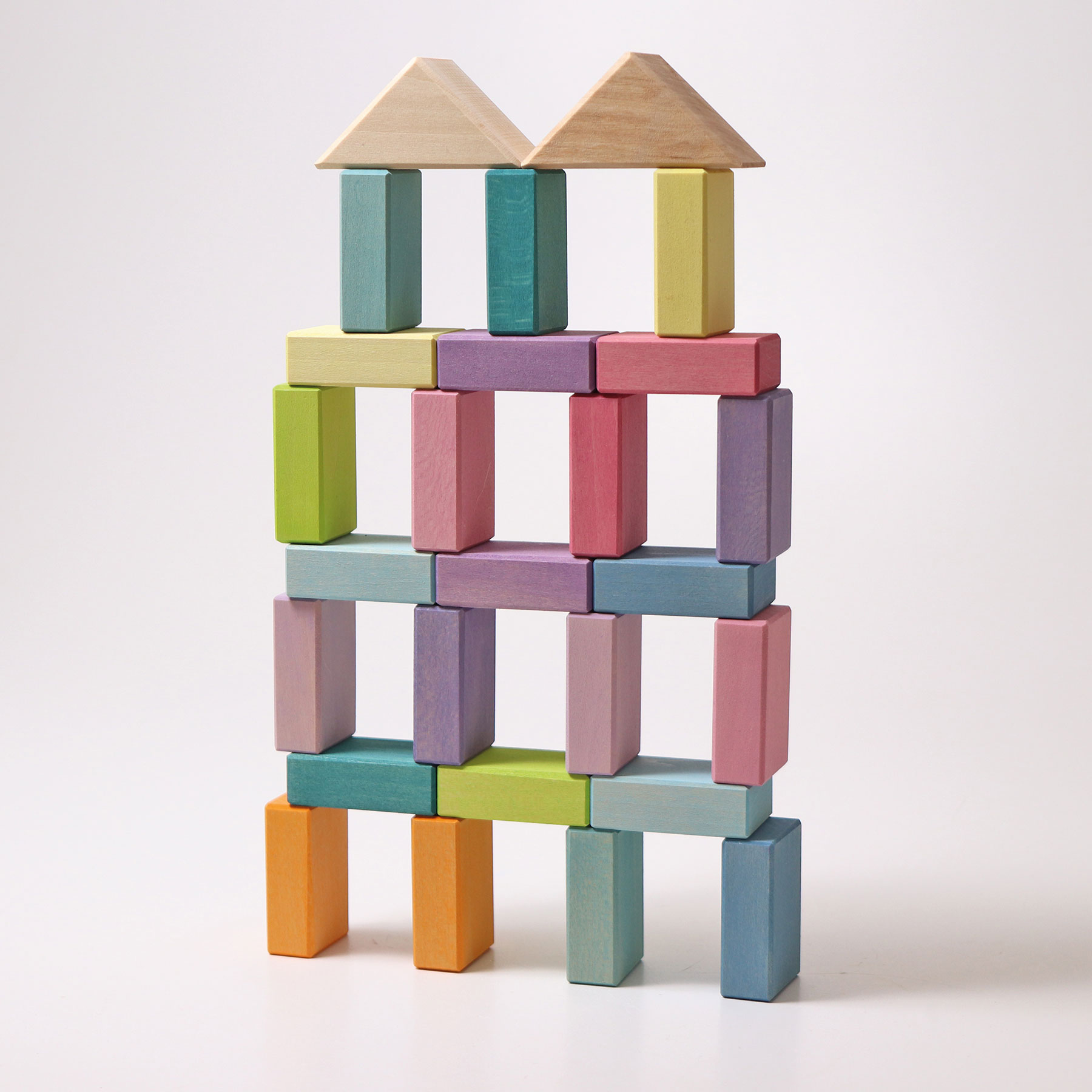 A pasztell duo szett gyönyörű építőkockákat tartalmaz – és mindenből duplát: két különböző geometriai alapforma, két színvilág, kétféle fa és pasztellszínenként két építőelem. A természetes színű háromszögek és a pasztell színű téglalapok kontrasztjai csodálatosan harmonizálnak egymással. Így a Pastel Duo nemcsak tökéletesen kiegészíti a GRIMM’S pasztell sorozatának építőanyagait, hanem színek és formák szerint is válogathatók, és számtalan játéklehetőséget nyújt