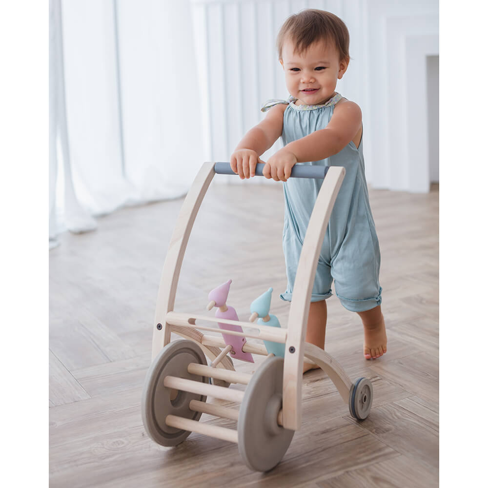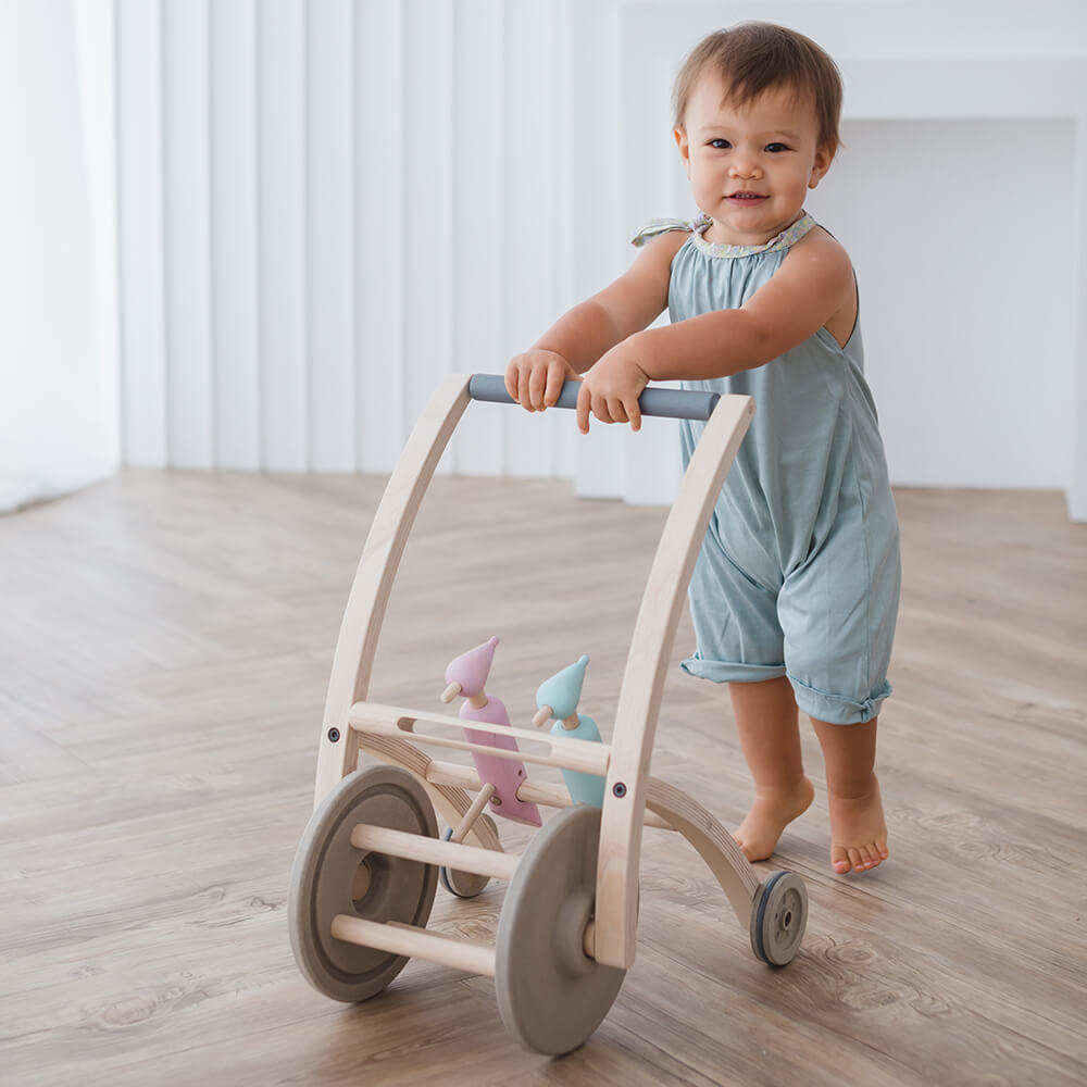A járássegítő stabil, így ha a gyermek el is veszíti az egyensúlyát a fogójába kapaszkodva nem esik el. Úgy lett kialakítva, hogy ne boruljon fel, hanem tökéletes stabilitást biztosítson a gyermeknek. A hátsó kerekeket egy gumi gyűrű veszi körbe, így a parkettán sem zajos.