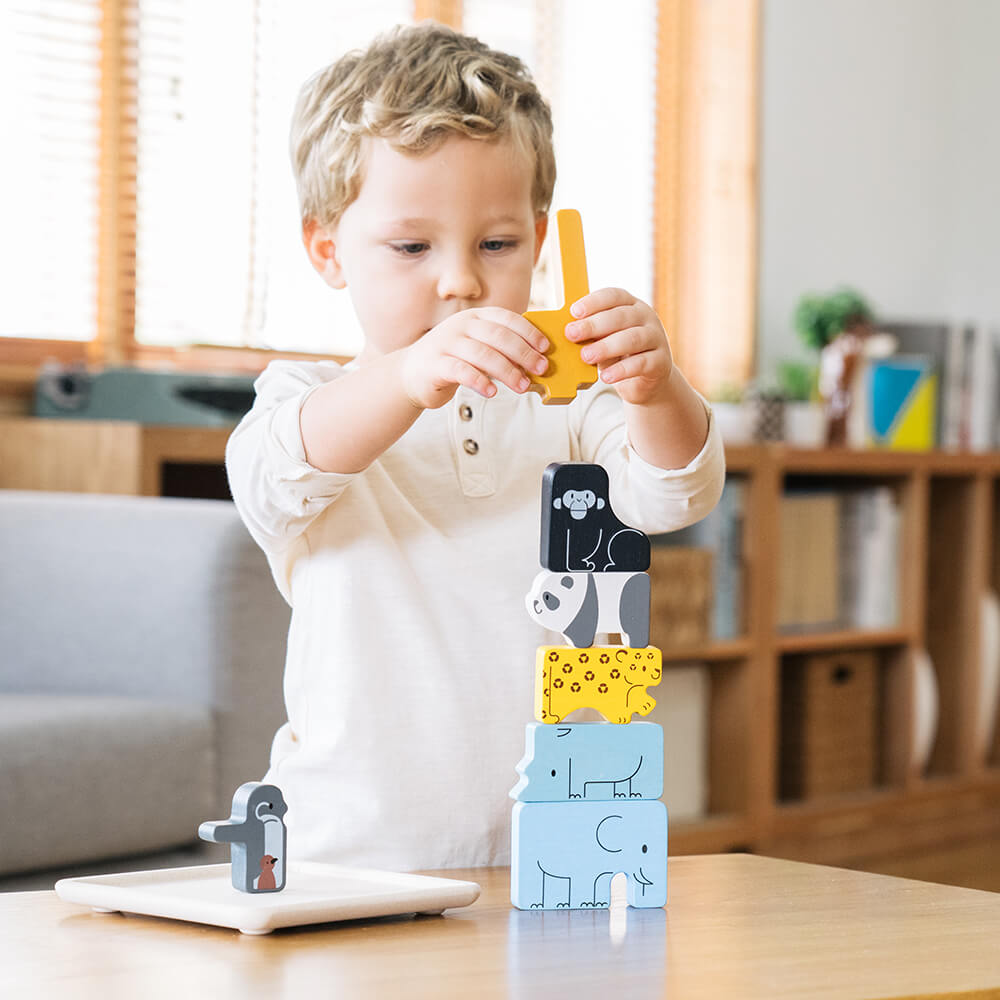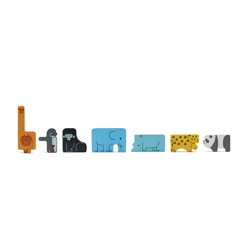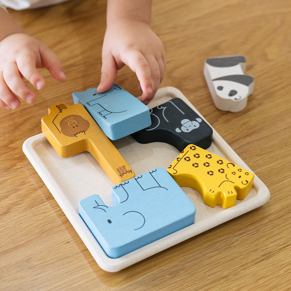 Ez a fából készült állatos puzzle játék elefántot, orrszarvút, pingvint, gorillát, orangutánt, pandát és leopárdot tartalmaz.
