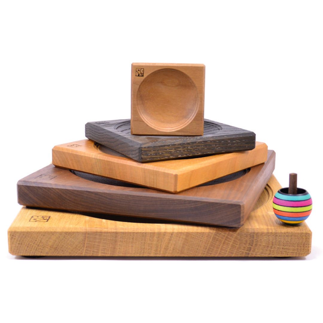 Remek alapot biztosítanak a pörgettyűknek ezek a gyönyörű tömötfa tálcák. A mélyedésből nem fog kitáncolni a pörgettyű, hosszasan csodálhatjátok, ahogy körbe-körbe forog.