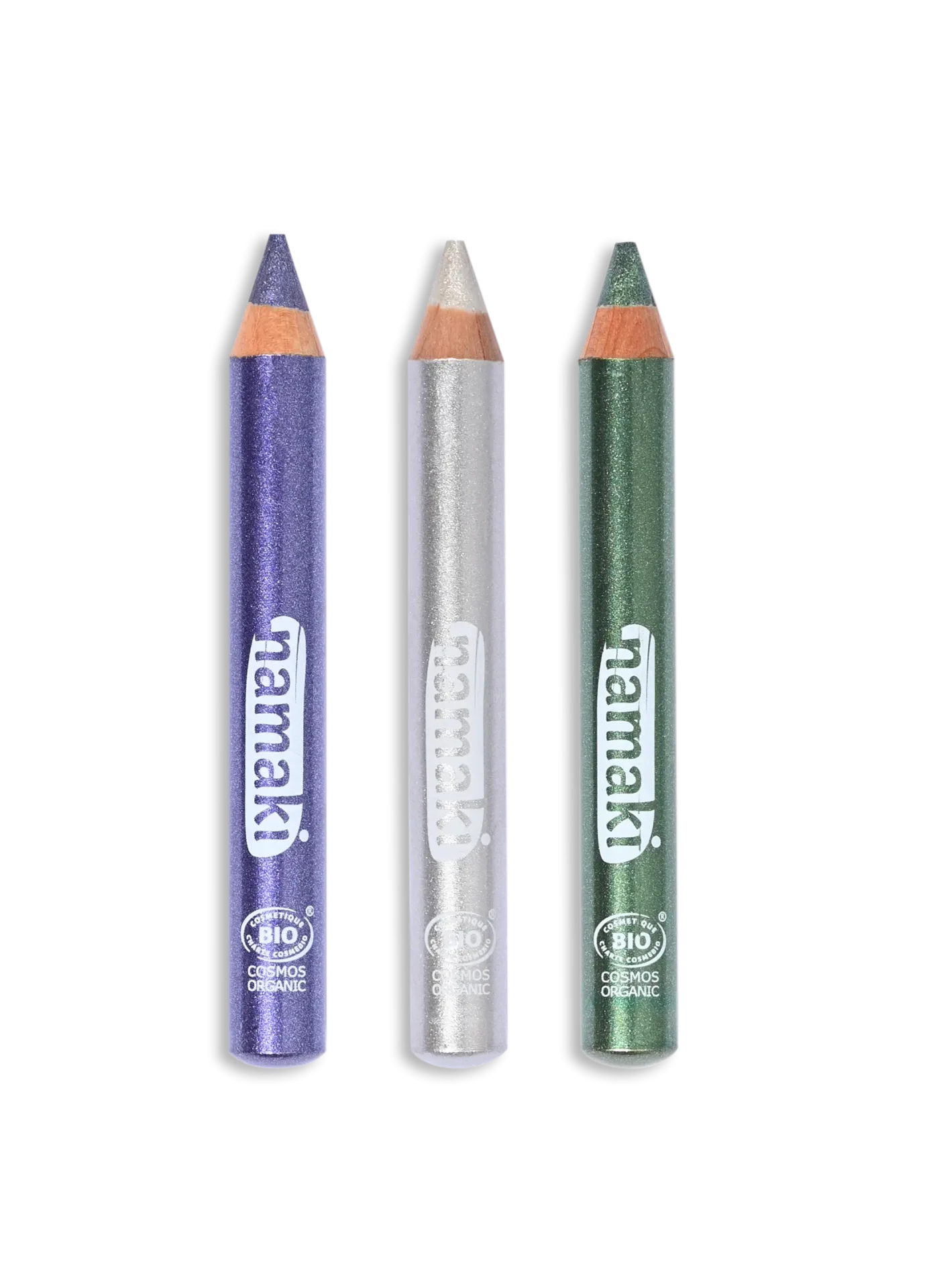 🌙 „Holdfény” csillogó sminkceruzák – 3 darabos készlet: Lila, Ezüst és Zöld árnyalatban