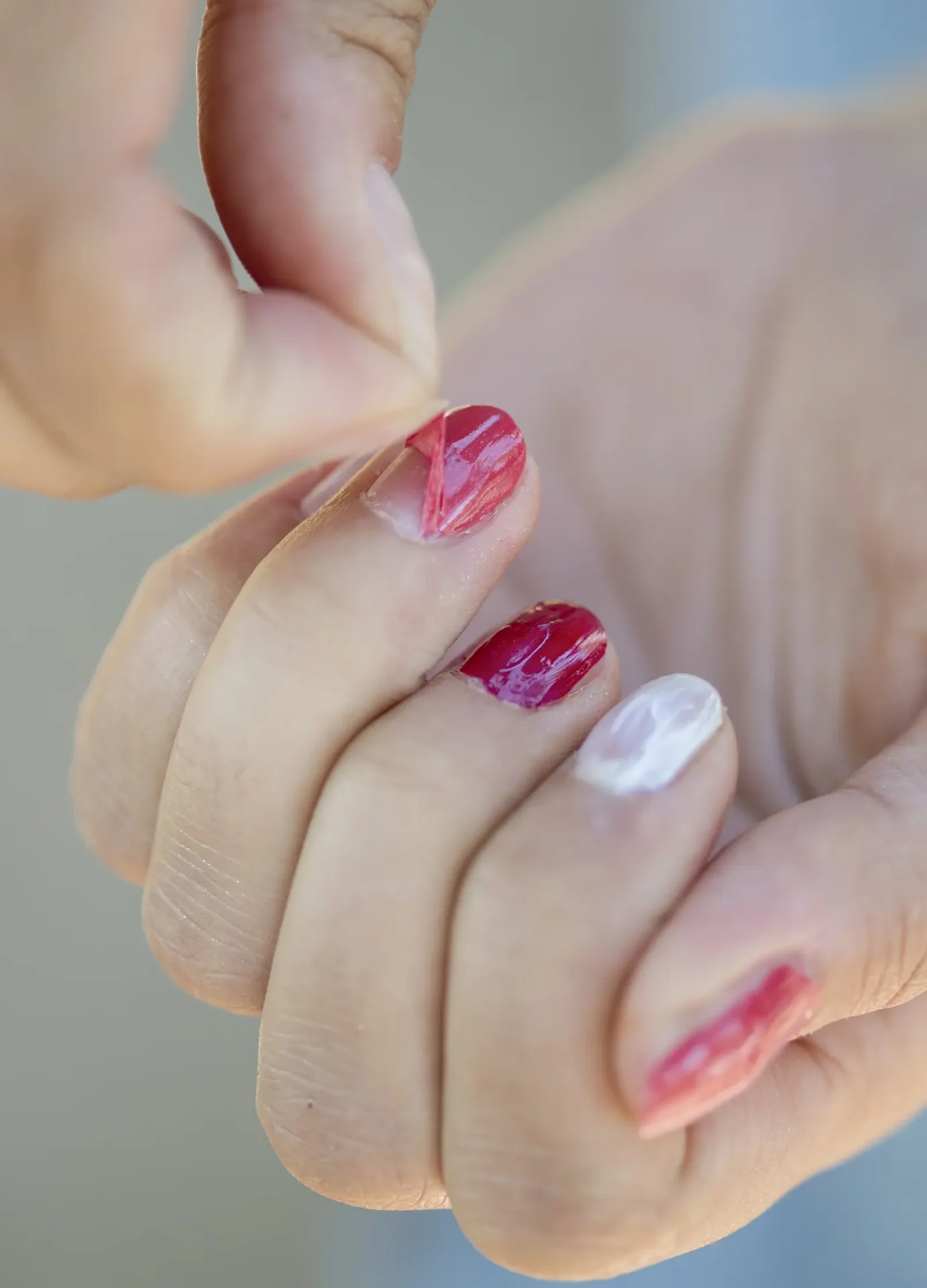 - Eltávolításkor a köröm egyik sarkátül kezdve kezdd lehúzni, mint egy matricát.