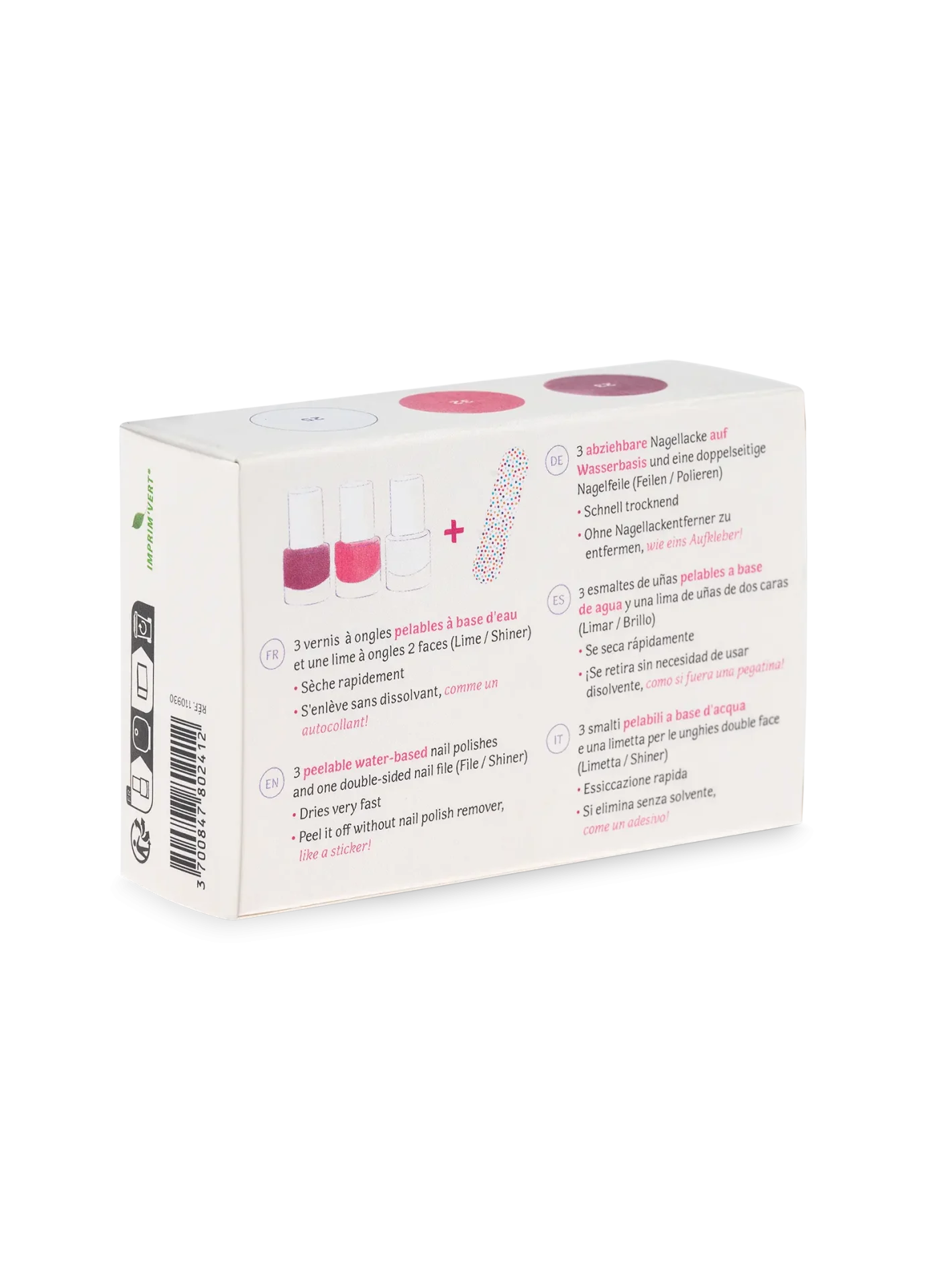 A játék-körömlakk szett vizes bázisú, vegán és teljesen mentes a káros összetevőktől (parabén, formaldehid, ftalát, toluol, kámfor). 🌿 Könnyedén használható: a lakk egyszerűen felvihető, és ha ráun a gyermek — akár eltávolítható is külön lemosó nélkül, mint egy matricás lakk! 🙌