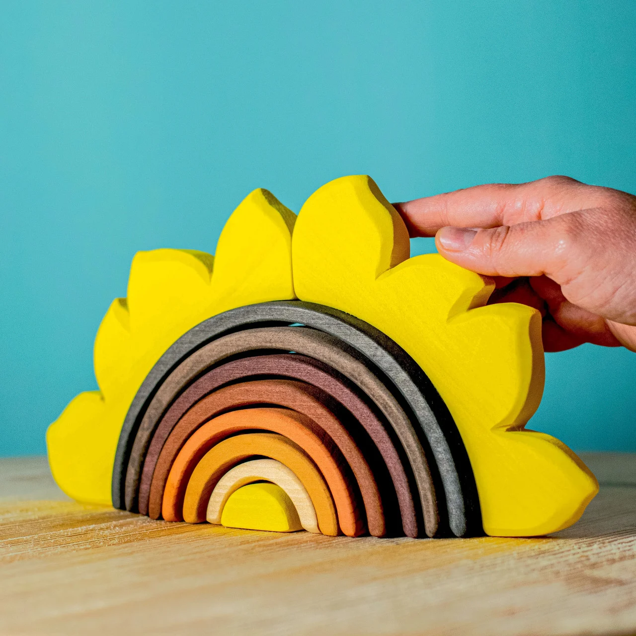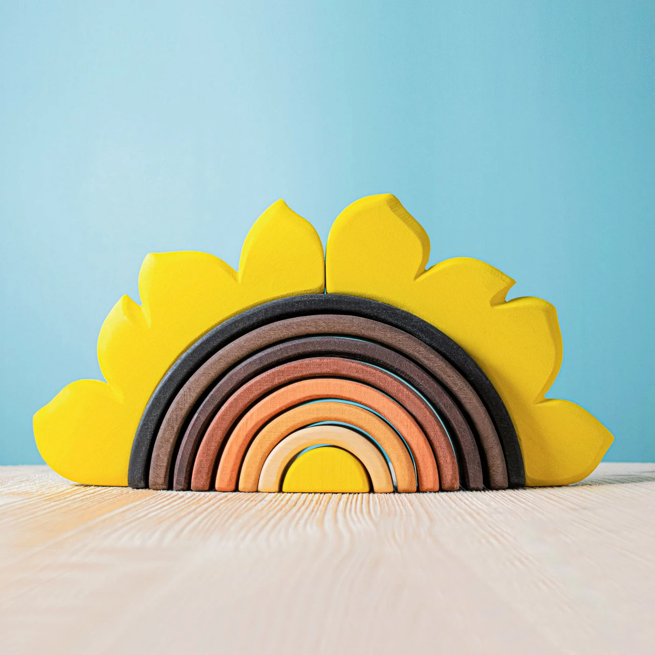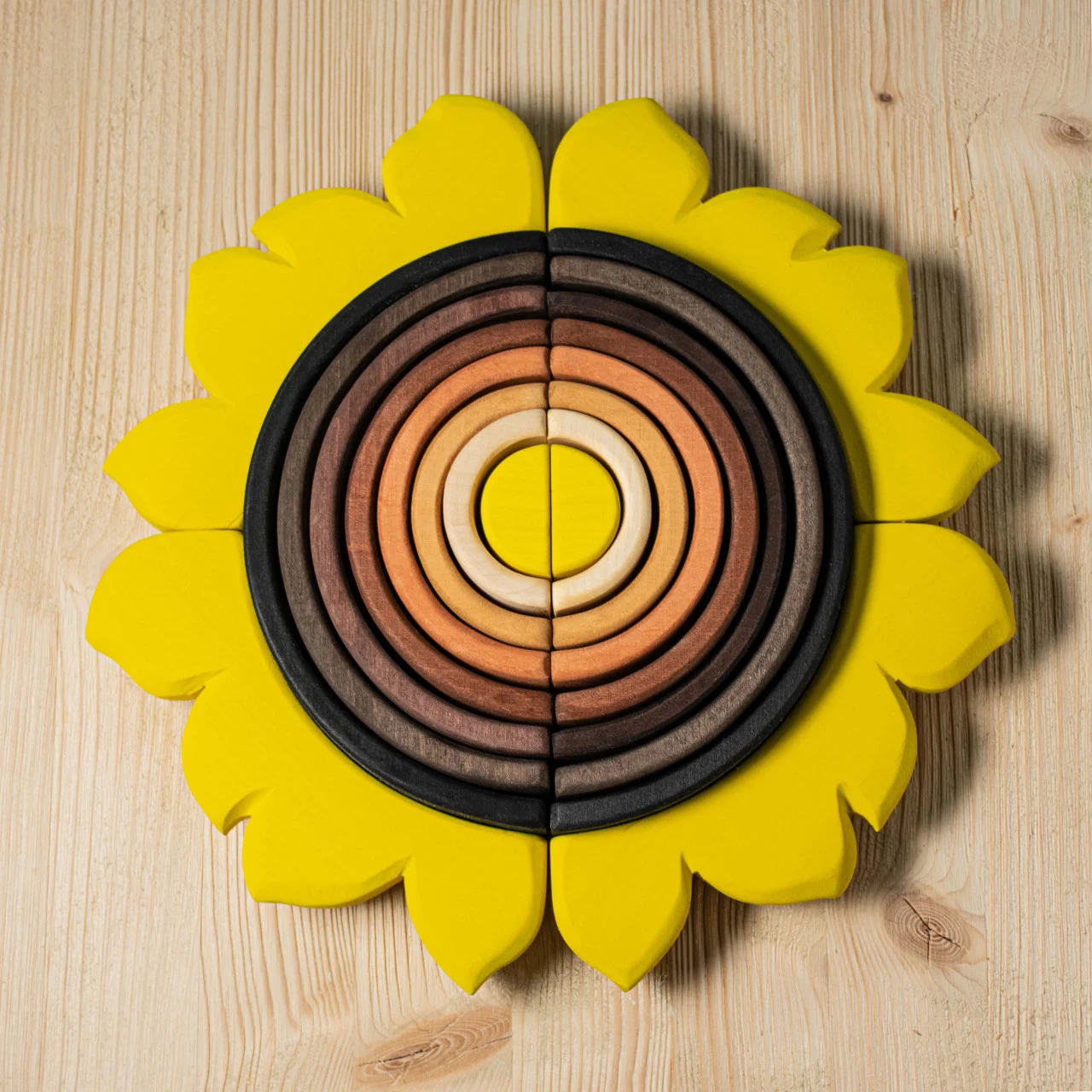 Ez a gyönyörű fa napraforgó a szivárványépítők mintájára készült. 8 db elemből áll, amelyeknek a felülete matt, nem csúszós, így kiválóan építhető.