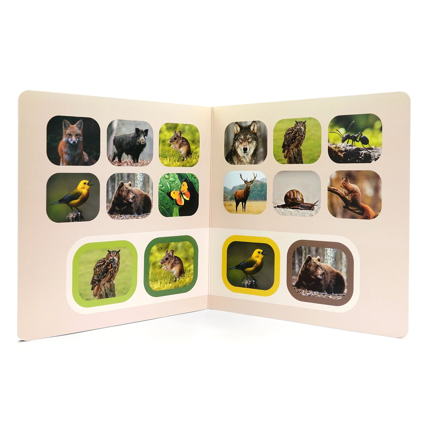 Fedezzétek fel együtt a Keress és találj könyvet az erdő állataival – egy fotó-alapú keresgélős kalandot az erdő legizgalmasabb lakói között! 🌳🦌 A könyv minden dupla oldalpárján valódi fotókat látsz, és a gyerekeknek meg kell találniuk 4 állatot a 12 közül – izgalmas „keresd meg!” feladat minden oldalon.