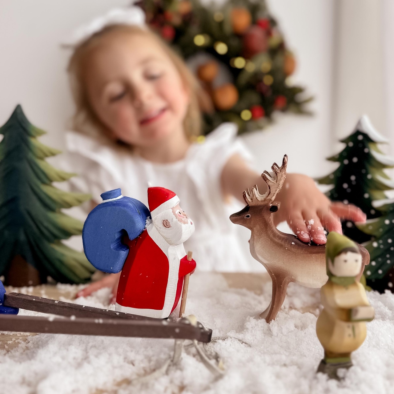 A fenntartható forrásból származó fából faragott és nem mérgező, vízbázisú festékekkel festett rénszarvas nemcsak biztonságos a 3 éves és annál idősebb gyermekek számára, hanem környezetbarát is. A fa sima, természetes textúrája és a finom, kézzel festett részletek ezt a rénszarvast minden játékkollekció bájos kiegészítőjévé teszik. Robusztus kialakítása tökéletes a fantáziadús játékhoz, lehetővé téve a gyerekeknek, hogy felfedezzék a téli csodaországok és havas kalandok történeteit.