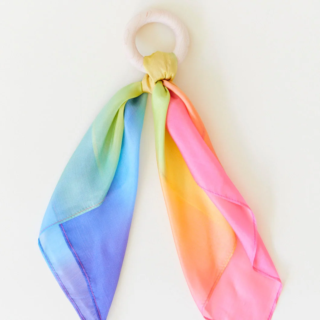 Csodálatos tapintási, szenzoros élmény a legkisebb korosztálynak, a babák könnyen meg tudják fogni a gyűrűt, és élvezhetik a selyem és a fa különböző textúráját.