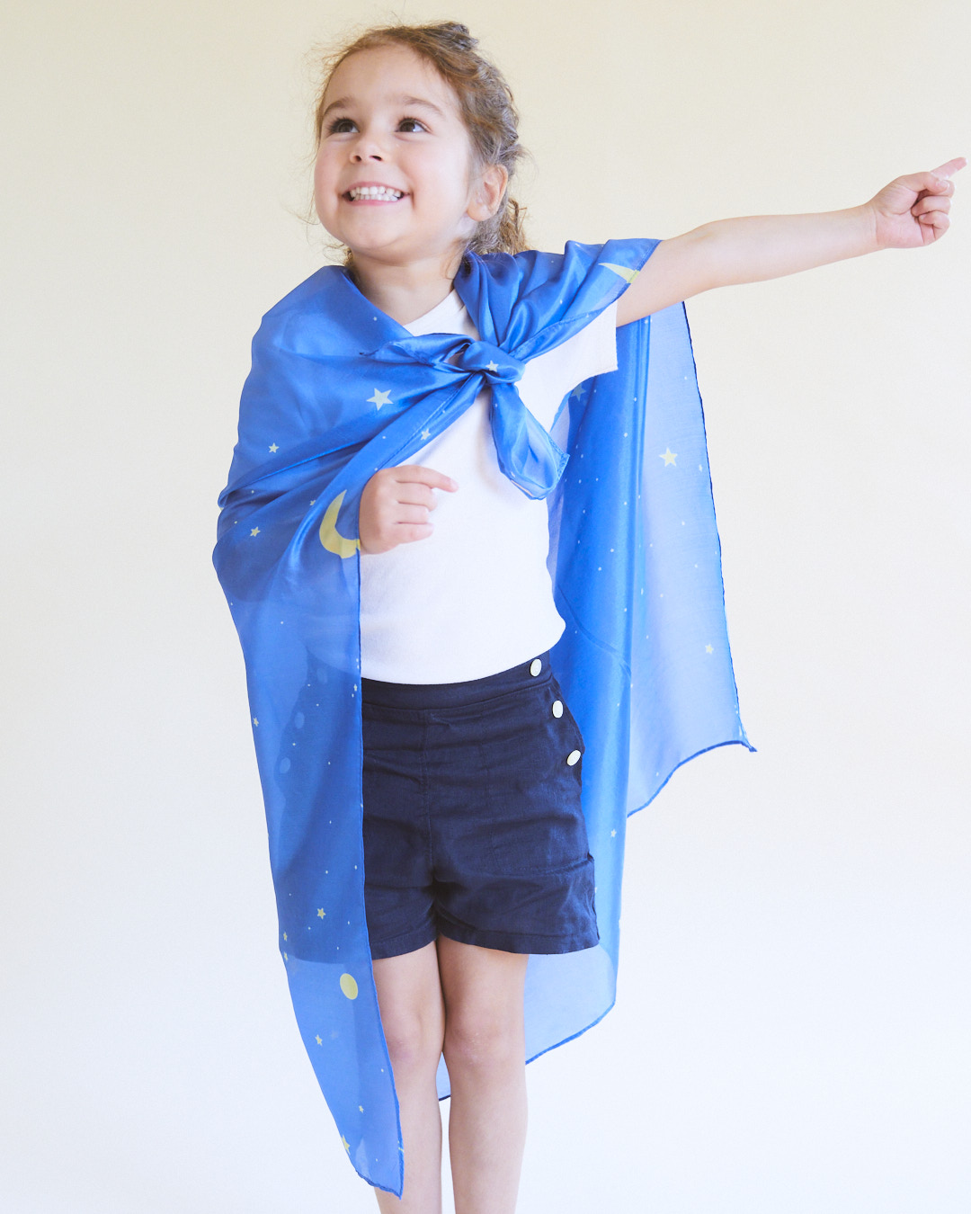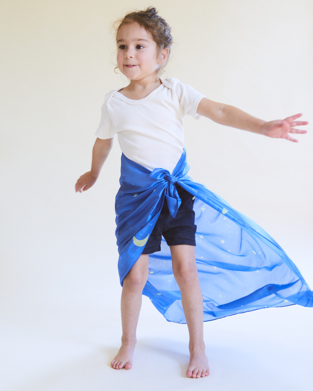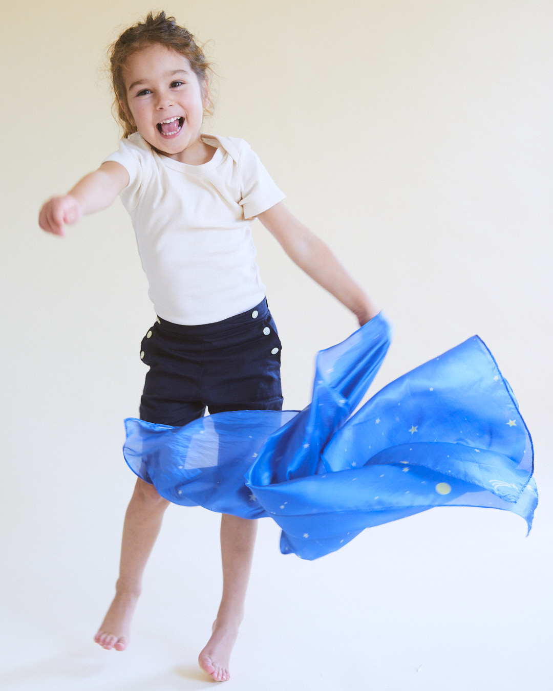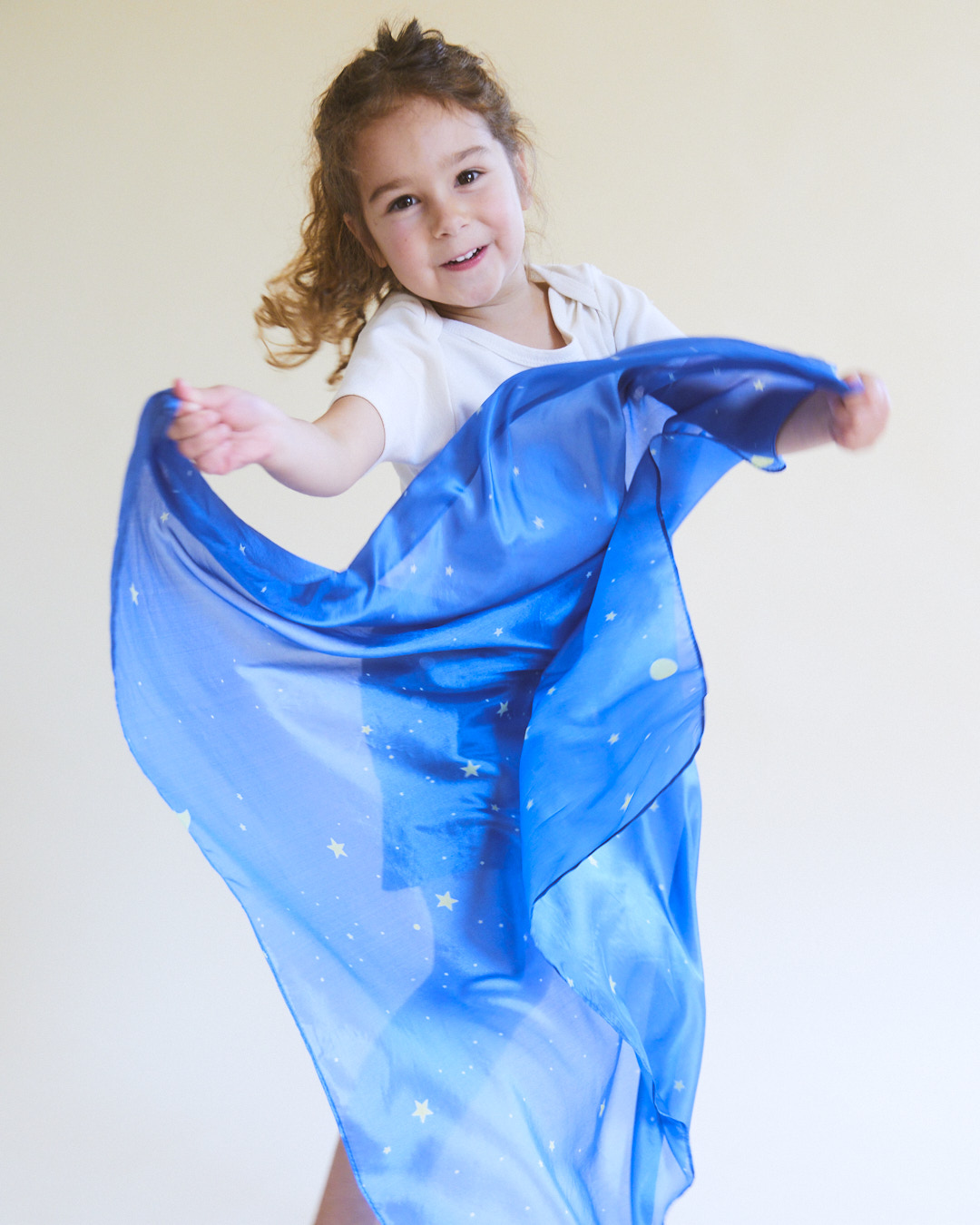 A játszóselyem hihetetlenül változatosan használható eleme a gyerekszobának. Használhatjátok beöltözős játékokhoz, lehet belőle palást, takaró, pólya a babáknak, szabad táncolás, szaladgálás közben csodásan játszik a levegőben, lehet Waldorf évszakasztalok alapja bunkerek, sátrak tetjén a csillagos égbolt, vagy kis csillagászok megfigyeléseinek célpontja.