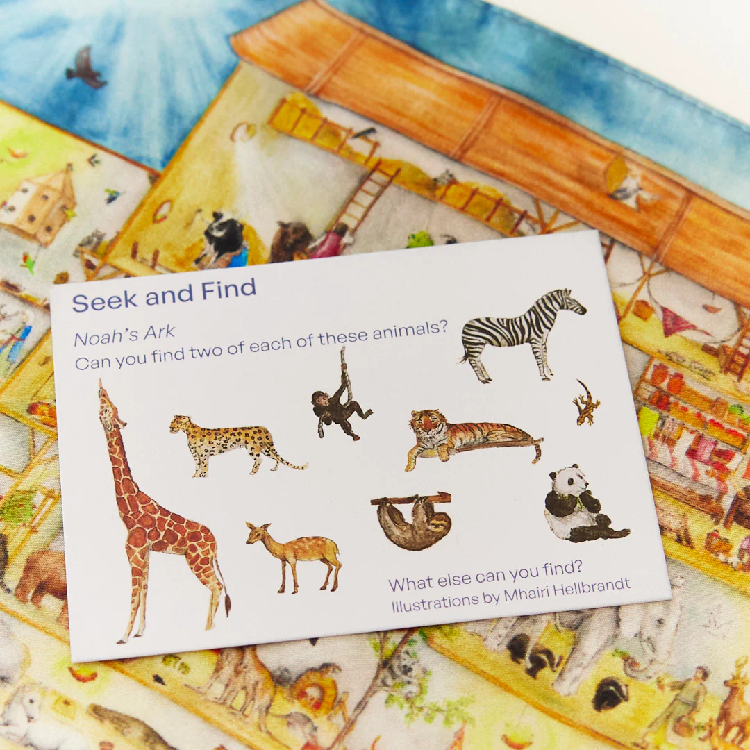 A Mini Mini játszóselyem – Noé bárkája egy különleges, kis méretű selyemkendő, amelyen a gyerekek a Noé történetéhez kapcsolódó állatokat és részleteket kereshetnek meg. A finom selyem tapintása és a részletgazdag illusztrációk együttese nyugtató, mégis aktívan bevonó játékélményt ad.