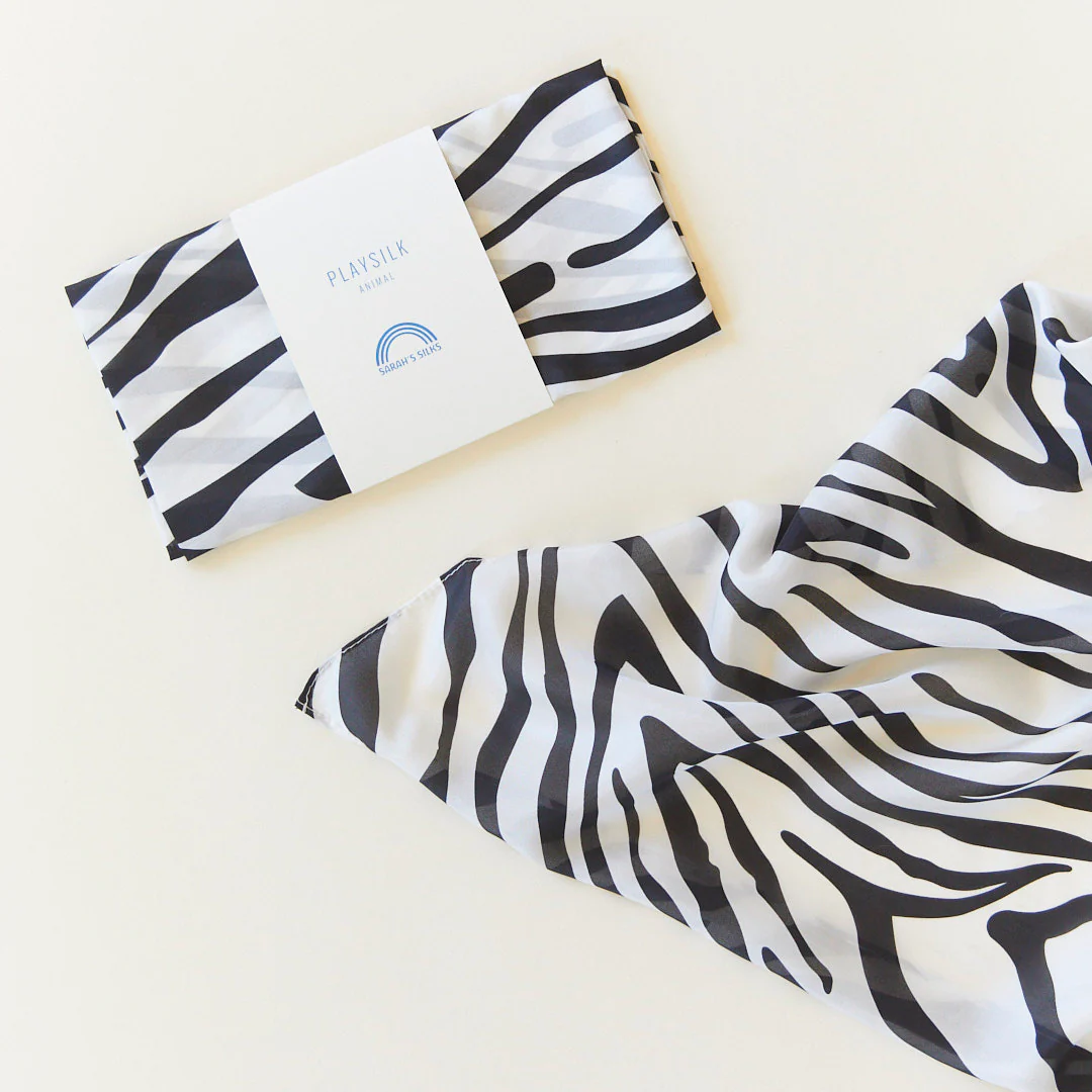 A Zebra játszóselyem egy nagyméretű, légies selyemkendő, amely játékszer, jelmez és díszlet egyszerre. A zebra minta azonnal inspirálja a gyerekeket mozgásra, szerepjátékra és történetmesélésre, miközben a selyem puha tapintása érzékszervi élményt is nyújt.