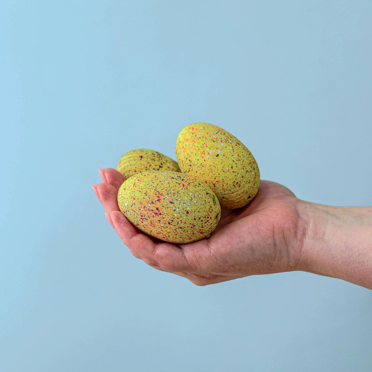A fenntartható forrásból beszerzett bükkfából készült és élénk színekkel festett tojások őskori kalandokra hívják a gyerekeket.