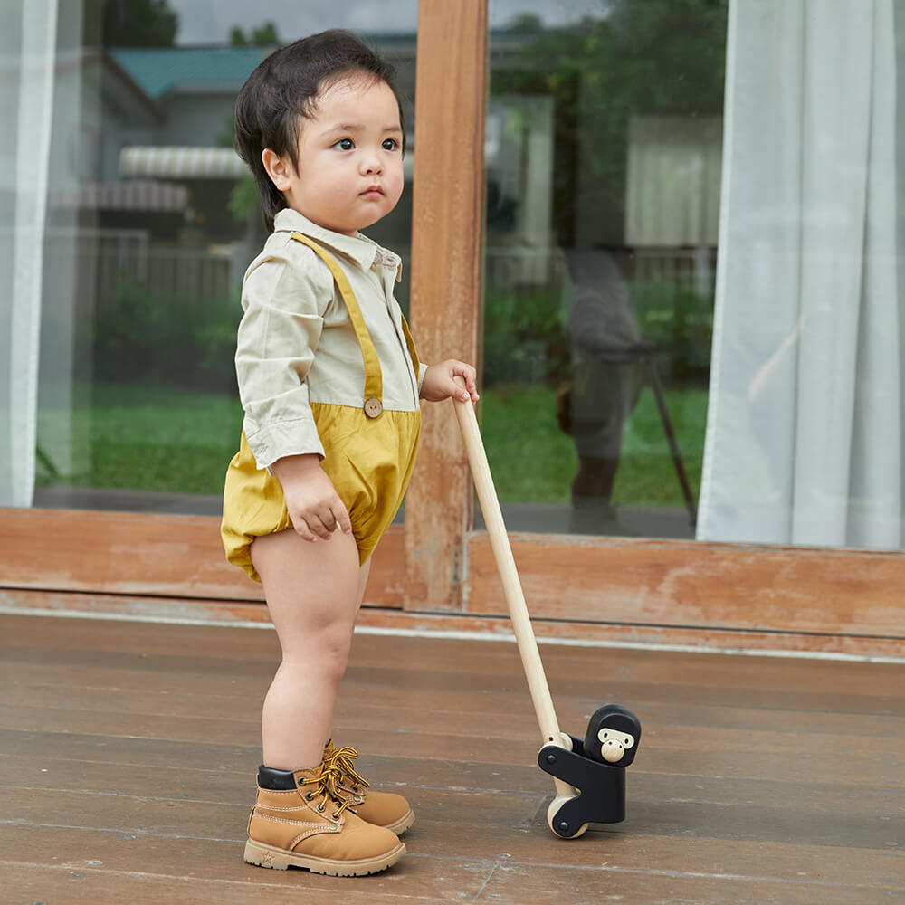 A gyerekek örömüket lelik abban, ahogy a gorilla mászó mozdulatokat tesz, miközben tologatják.