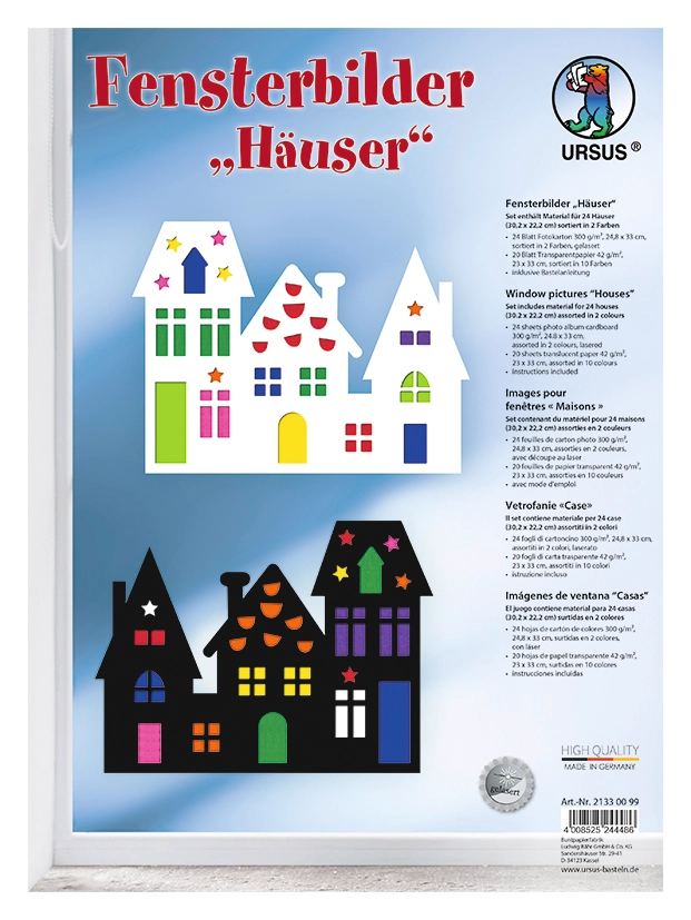 A készlet tartalmaz 24 előre vágott házikó-sziluettet (kb. 30,2 × 22,2 cm) valamint 20 lap színes átlátszó papírt/transparent papírt, hogy a házikók ablakai, tetői ragyoghassanak a fényben.