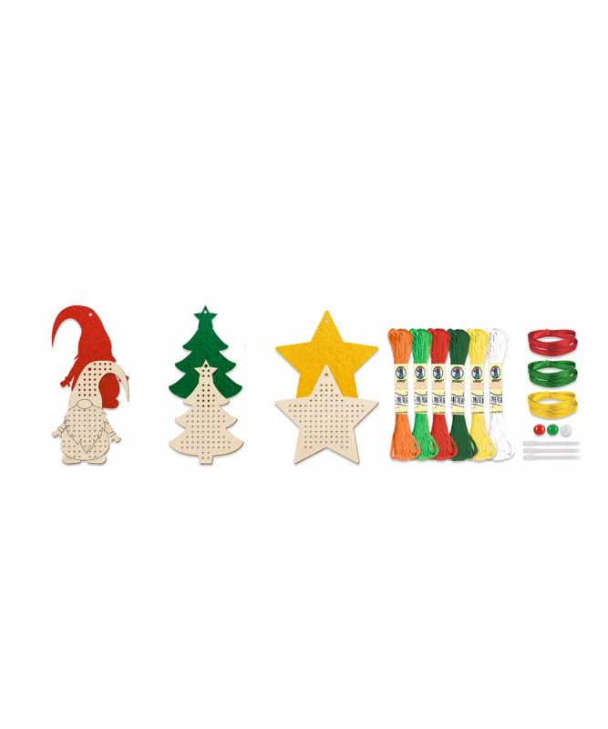 Készítsétek el a karácsonyi díszeket ezzel a szuper szettel. A csomagban találtok 3 db, nagyjából 10×8 cm méretű fa hímzőalapot (manó, csillag, karácsonyfa), filcmatricát, amit az elkészült dísz hátuljára tudtok ragasztani, 3 db fa gyöngyöt, 3 db szaténszalagot, hímzőfonalat 6 színben, 3 db tűt a hímzéshez, valamint instrukciókat.